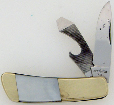 Two blades - a drop point and a file, caplifter, screwdriver blade. Permobright tarnish-proof brass bolsters and liners. Coral sea Mother of Pearl inlaid handles. Comes new in original Kershaw flip up vinyl box.