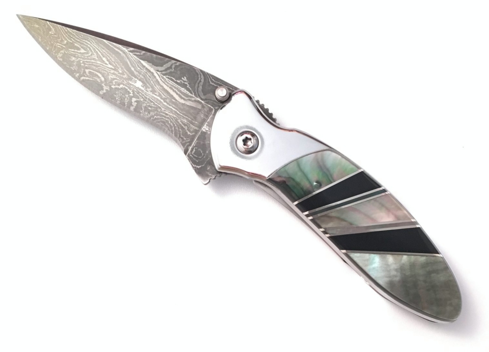 Awesome stainless steel handles with beautiful black lip pearl, black jet stone and stainless steel onlays. Alabama damascus steel drop point blade. Assisted opening makes this knife real easy to open and the frame lock makes this knife real easy to operate with one hand. Dual thumb studs. Removable pocket clip for tip down carry. Lanyard hole. Blade lock on the bottom to keep it closed while it's in your pocket. Awesome Kershaw pocket knife made beautiful by the artisans at Santa Fe Stoneworks. Comes brand new in box.