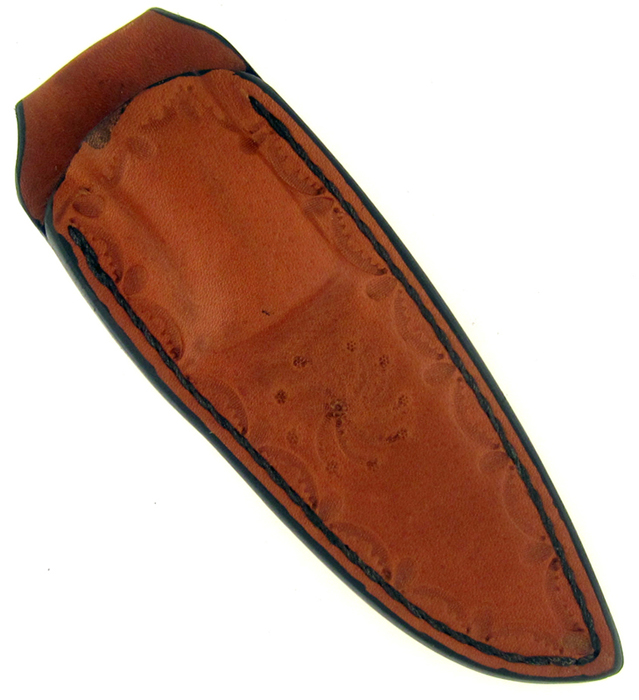 Beautiful genuine Oosik handle scales with awesome coloring. Hand forged damascus drop point hunting blade. Tang stamped BREED. Full tang. Nickel silver handle pins. Brass finger guard. Superb bang for your buck with these Kim Breed custom knives. Comes with a quality leather sheath by Gary Wheeler.