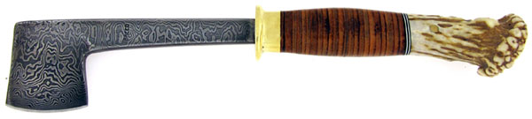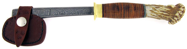 Really nice stacked leather handle with black and nickel silver handle spacers. Damascus axe blade and shaft. The shaft is stamped BREED. Cool deer antler pommel with a single brass handle pin. Nickel silver guard. This is one cool axe that was proudly made in the U.S.A. Comes with a quality leather blade cover sheath.