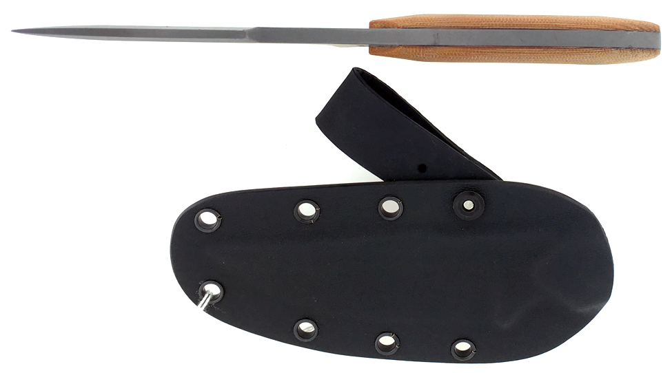 Awesome dark tan Westinghouse canvas micarta handle scales. Two tone matte finished 80CRV2 high carbon steel tactical hunting blade. Full tang construction from thick 3/16 stock. Tang stamped BREED. Two large matte finished steel handle pins and lined lanyard hole. Finger choil for excellent grip. Awesome custom tactical hunting knife by Kim Breed. Includes formed kydex sheath with belt loop.