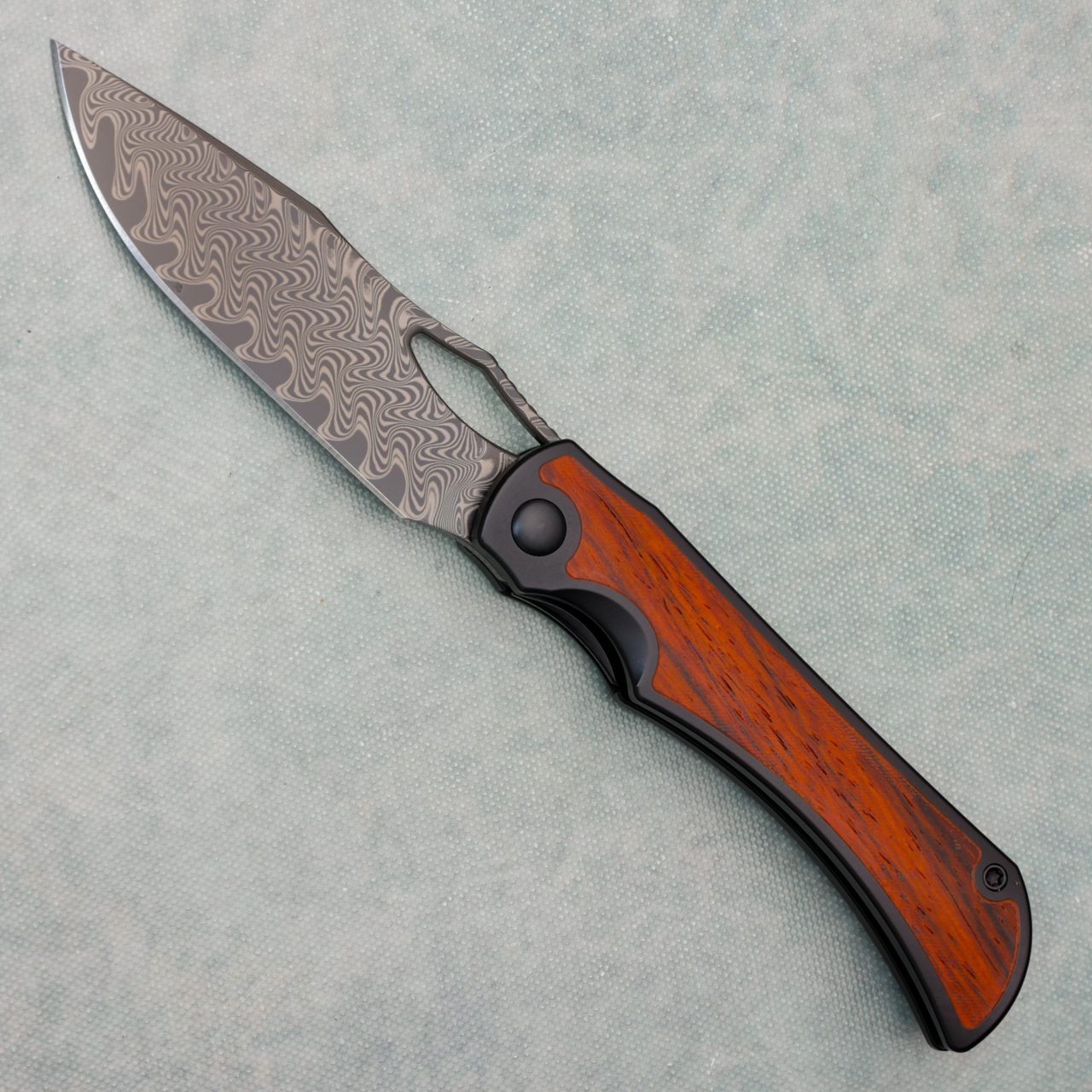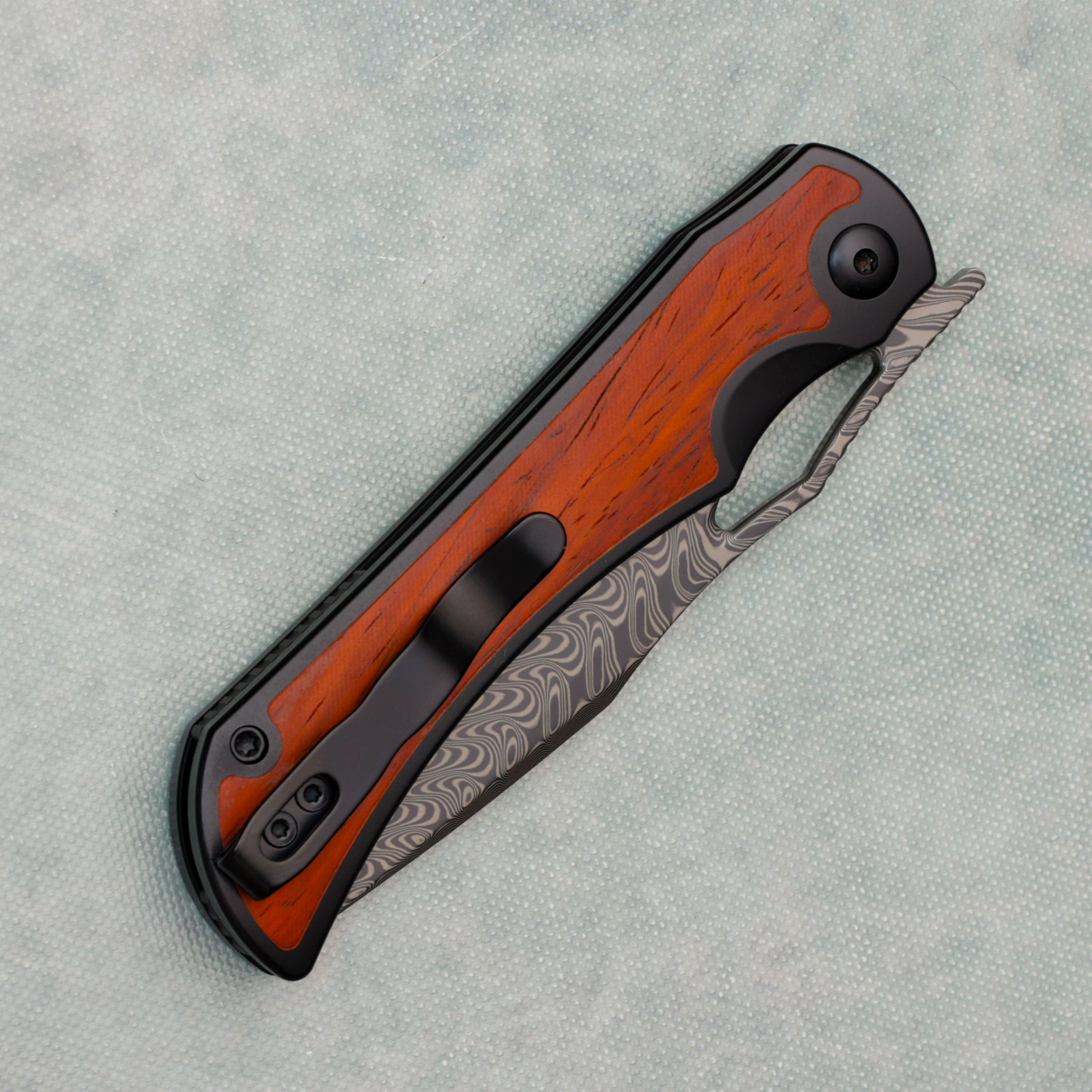 The Allure is designed by Johan Jordaan, and looks and feels amazing. Black titanium handles with wood inlays. Damascus blade. Front flipper and hole deployment. New in box.