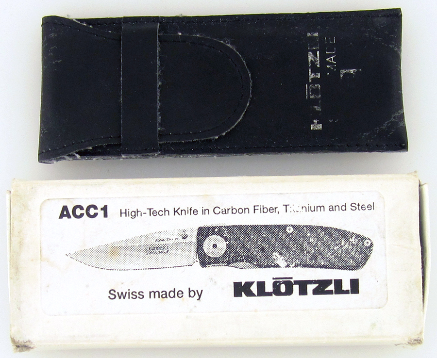 Awesome lightweight polished carbon fiber handle scales. Two tone satin/mirror polish finished 440C high carbon stainless steel clip point blade etched KLOTZLI SWISS MADE 440C WALKER DESIGN. The thumb stud and liner lock make for easy one handed operation. This knife is really lightweight yet still very durable. Thumb jimping on the spine for better grip and control. Will make an excellent pocket companion. New in box with Klotzli leather slip pouch.