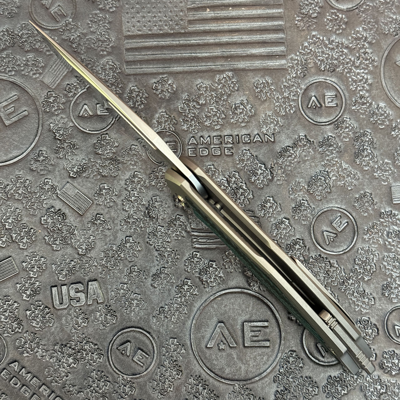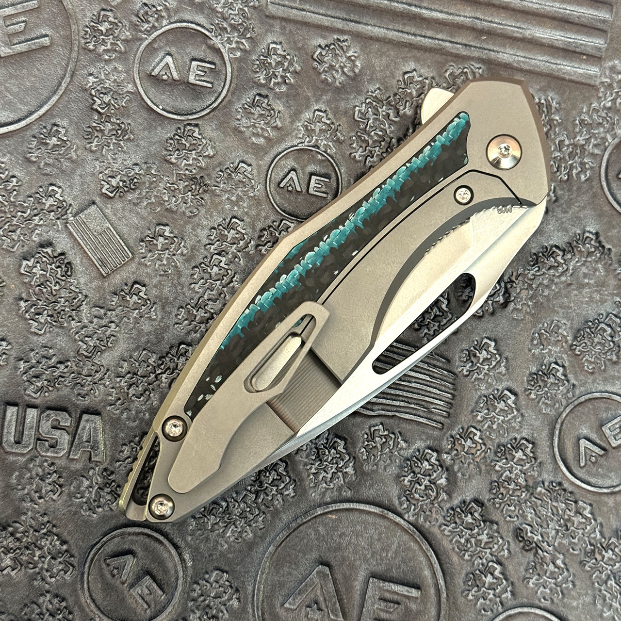 This model is from May 30, 2024. It features a smooth teal carbon fiber top scale and titanium bottome scale handle. The drop point blade is brightwashed Magancut with polished flats. Brand new in box with COA, sticker, and polishing cloth.