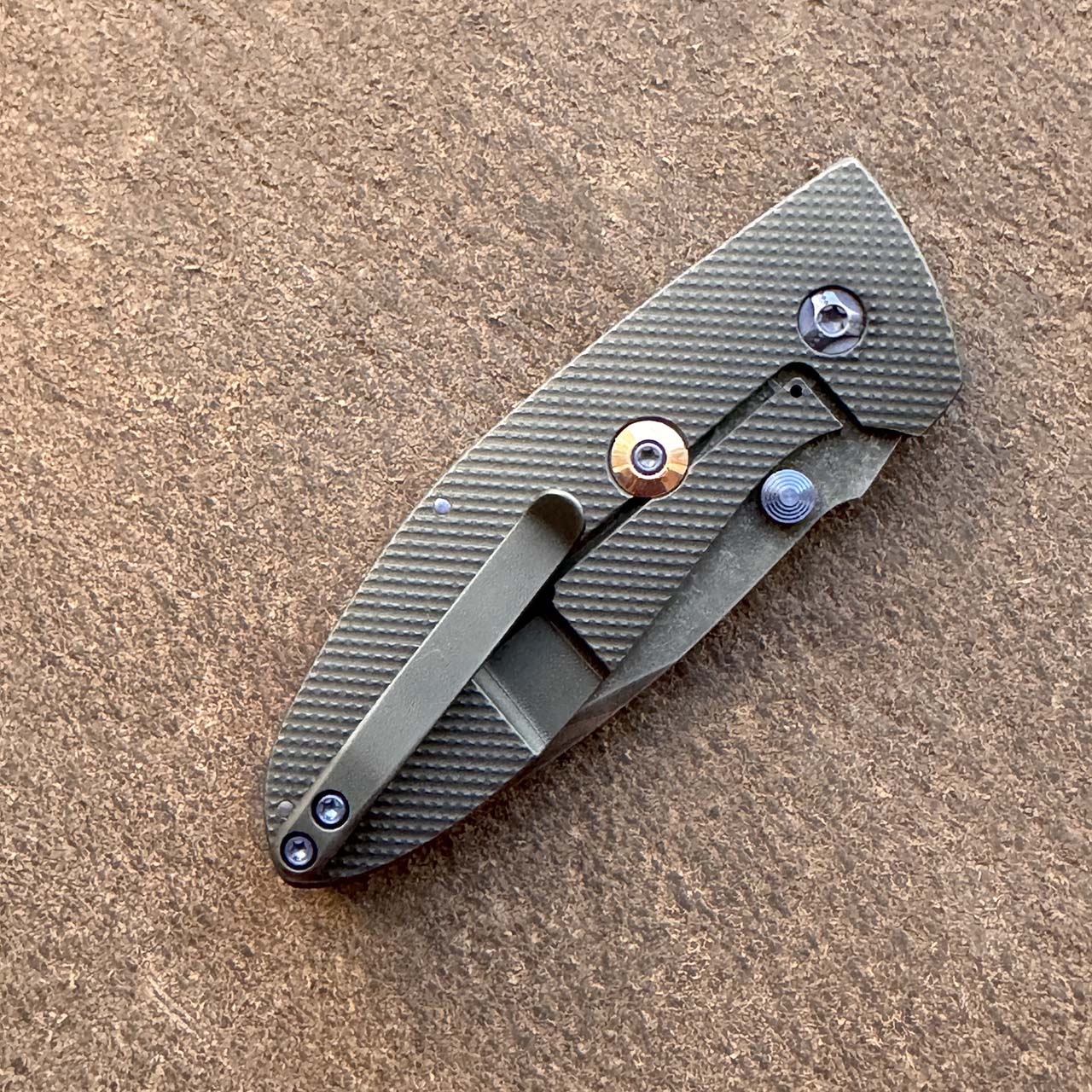 This custom Alpha from Krein Knives is beautiful! Baker Forge DarkMai Damascus compound ground 80CRVZ blade. Battle blackened checkered titanium scales with blue titanium hardware, copper backspacer, and overtravel. This would be a great collection piece. New in pouch.