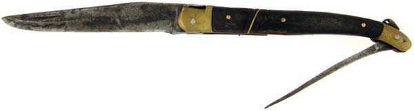 Awesome antique ebony wood handle scales that are still in great shape for their age. High carbon steel clip point blade stamped LAGUIOLE THIBAUD ASEVERAS and long leather punch blade. The blades have good strong open and close snap. Brass bolsters, liners, handle pins, and inlaid brass lines in the handle. The spine has the signature Laguiole forged bee and a lanyard hole. This a fine French made antique knife by Laguiole. Still in excellent condition with a real nice patina.