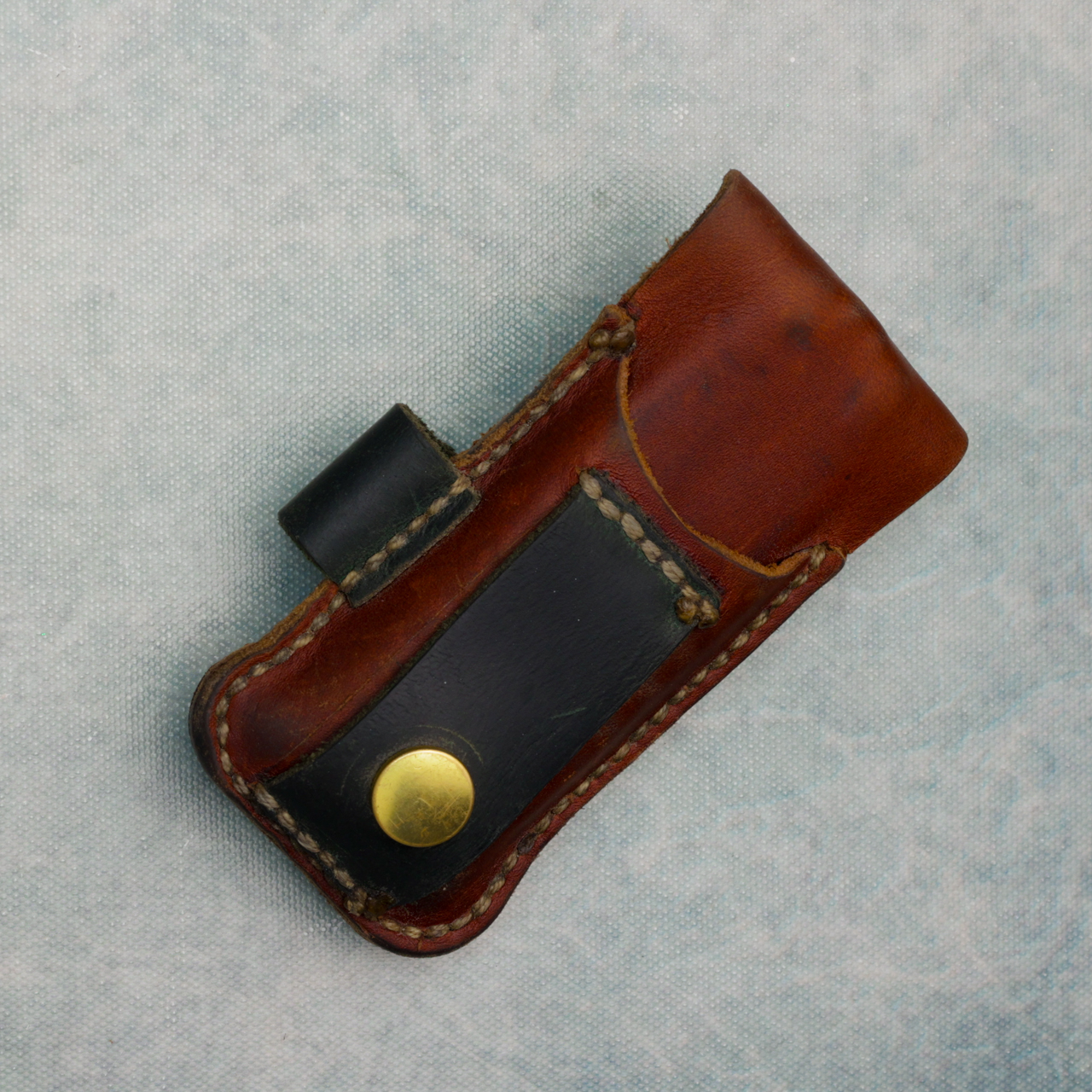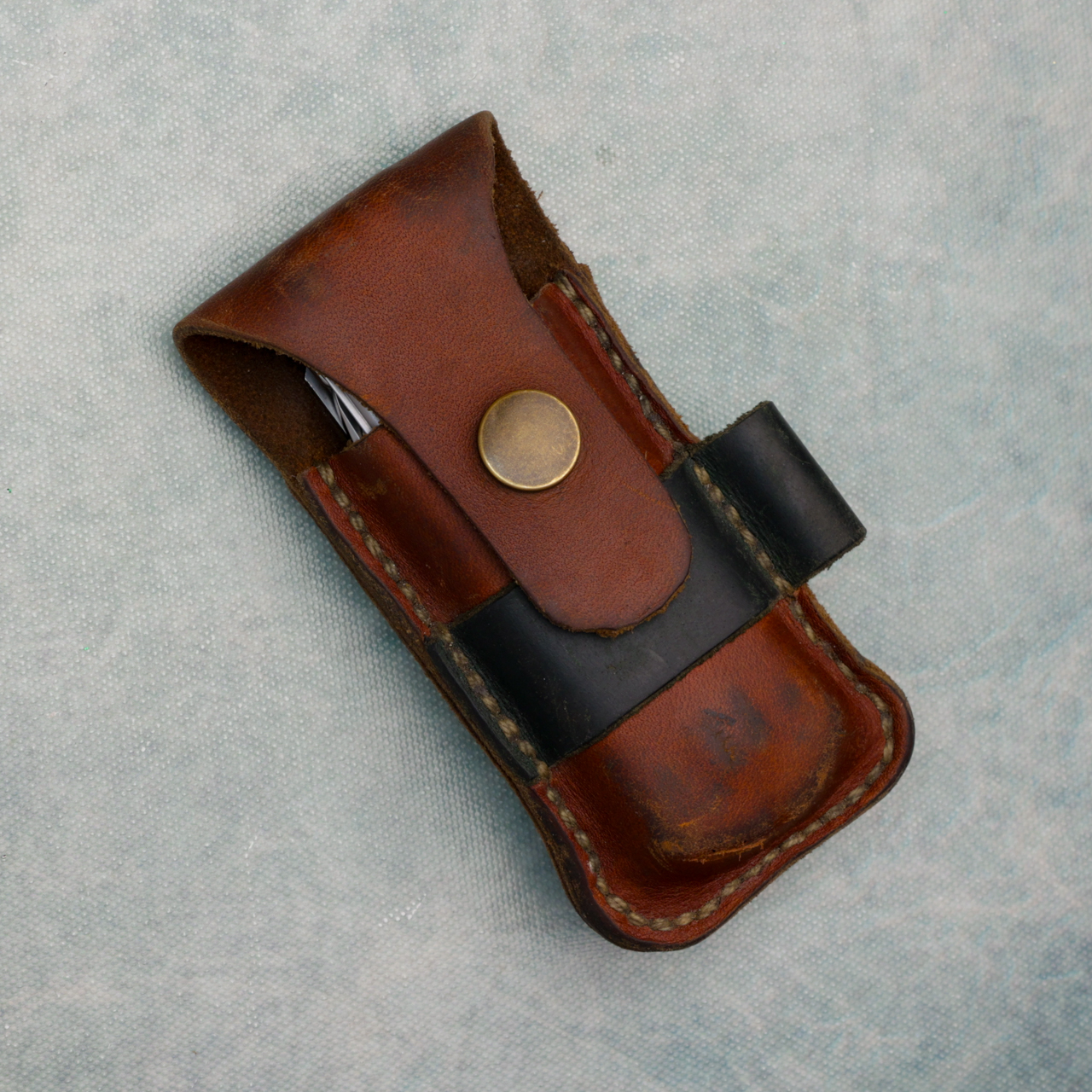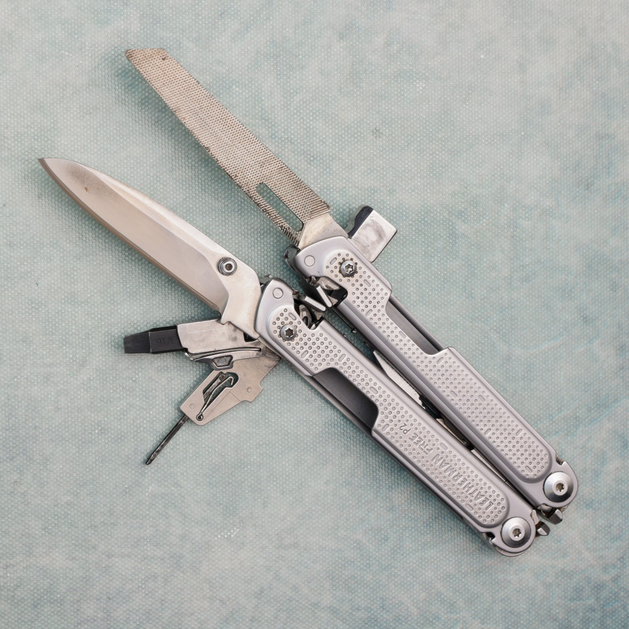 Designed for unmatched comfort, durability, and ease of use, the P2 represents decades of consumer feedback, testing, and engineering. Integrated FREE technology means all tools are easily accessed with one hand, open smoothly, and click into place with a confident snap. Proudly made in Portland, Oregon. This one shows some wear, and has been customized and some of the tools have been swapped for others. It comes with a handmade leather sheath that can also hold a pen and will fit on your belt.