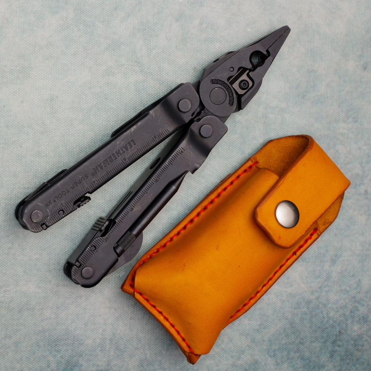 The award-winning, Leatherman Super Tool 300 is made for getting hard work done. This multi-tool's large pliers are among the strongest we've ever produced. Not only are these pliers capable, but the sloped-top handle design lets you maneuver them further into tight spaces. Large cutouts in the handles make it easy to open tool features, even with gloves on. The rolled handles make for a comfortable grip, perfect for daily use. Stranded, hard and regular wire cutters all come standard on Super Tool 300. And because they're removable, you can repair or re-sharpen on the spot. Equipped with 19 durable tools, it’s ready to tackle your toughest jobs. Shows some wear, comes with handmade leather sheath you can carry on your belt.