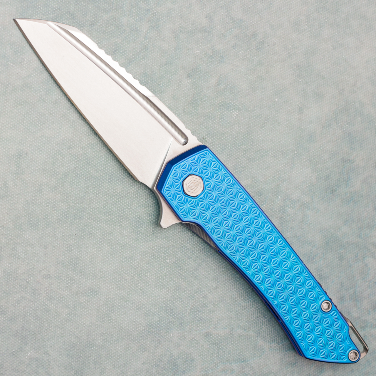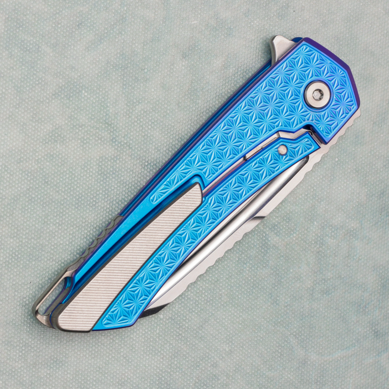 This model features a stars textured titanium handle anodized electric blue. Stonewash finished CPM-S90V stainless steel wharncliffe blade. Brand new in hardcase with qc card, lube, and bit.