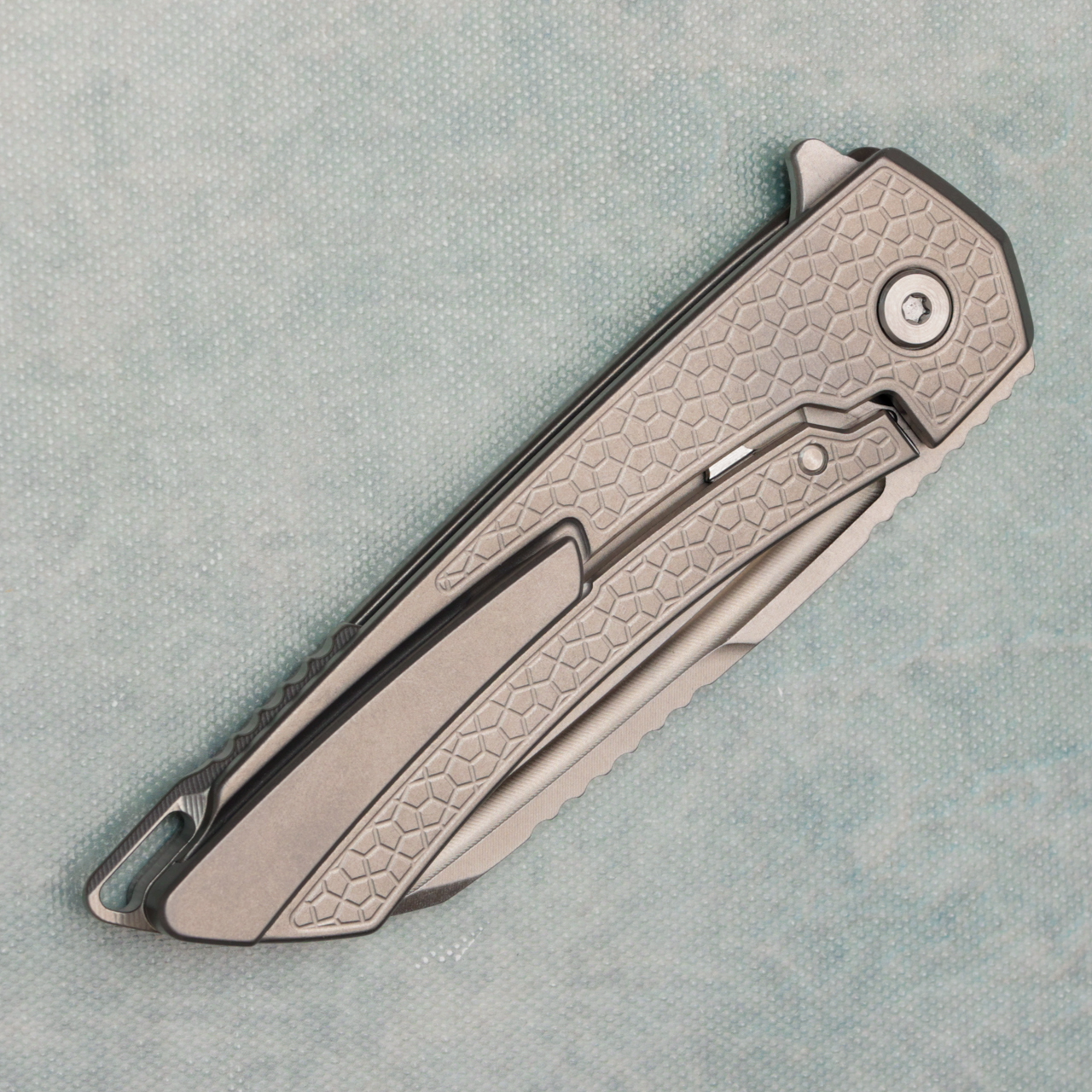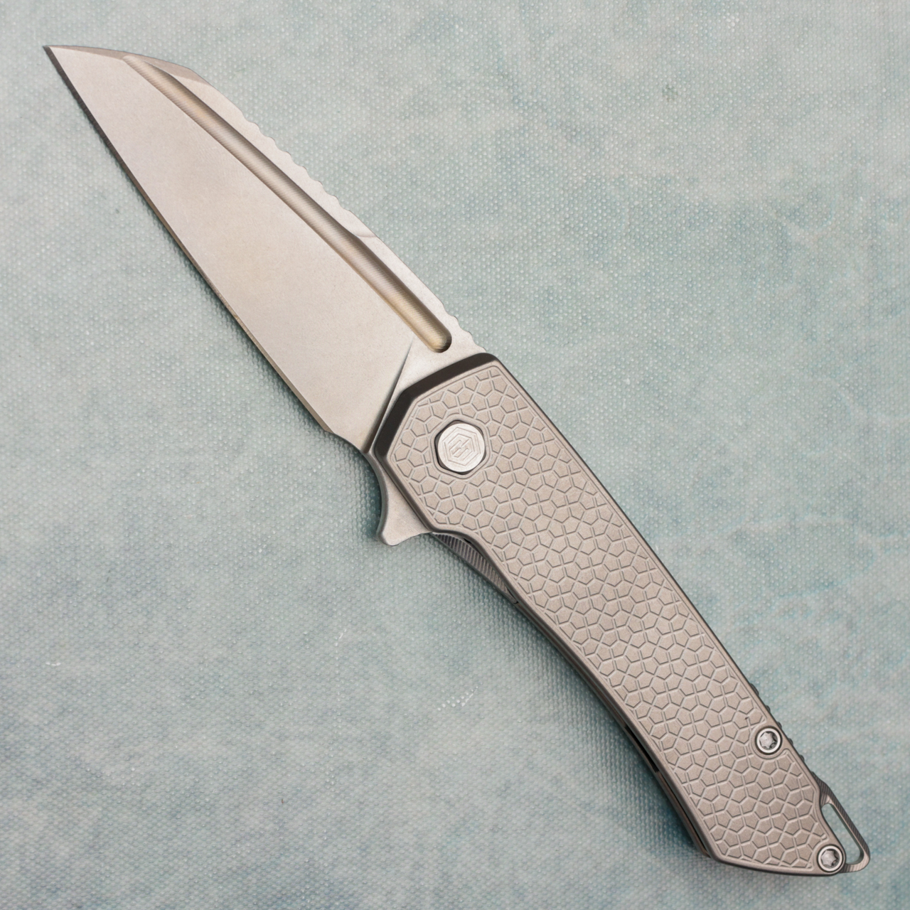 This model features a turtle textured titanium handle. Lightwash finished CPM-S90V stainless steel wharncliffe blade. Brand new in hardcase with qc card, lube, and bit.