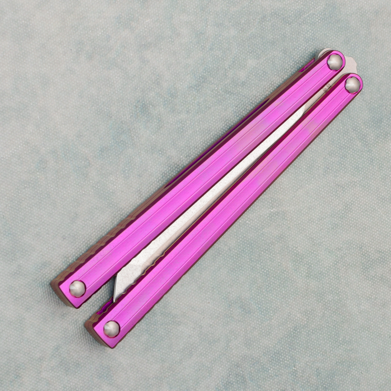 MachineWise Opus V2 Balisong Pink Titanium Texture Handle Stonewashed S35VN Blade