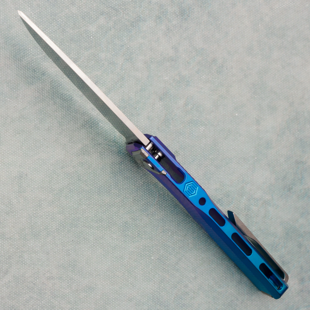 This model features a aqua fade anodized titanium integral handle with streamline texture, and titanium bolster. Stonewash finished CPM-S90V stainless steel drop point blade. Brand new in hardcase with qc card, bolster coin, and bit.