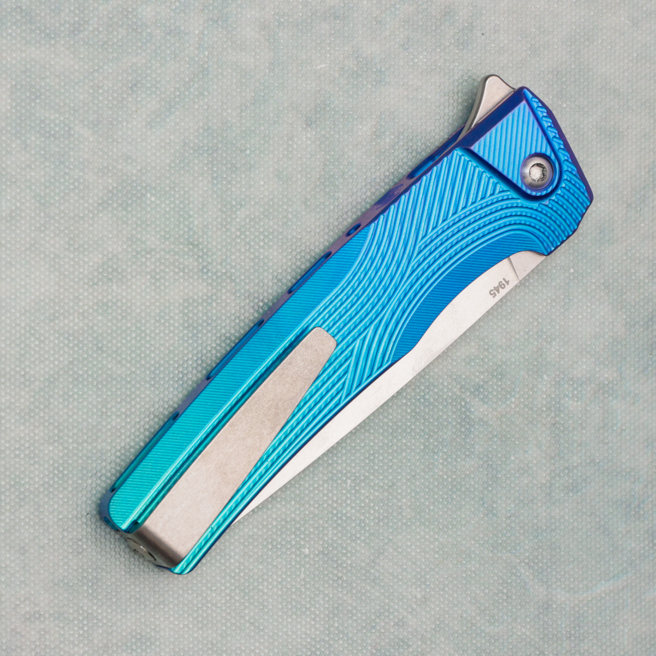 MachineWise Sonora Button Lock Flipper Aqua Fade Streamline Pattern Titanium Integral Handle Titanium Bolster Stonewashed S90V Blade