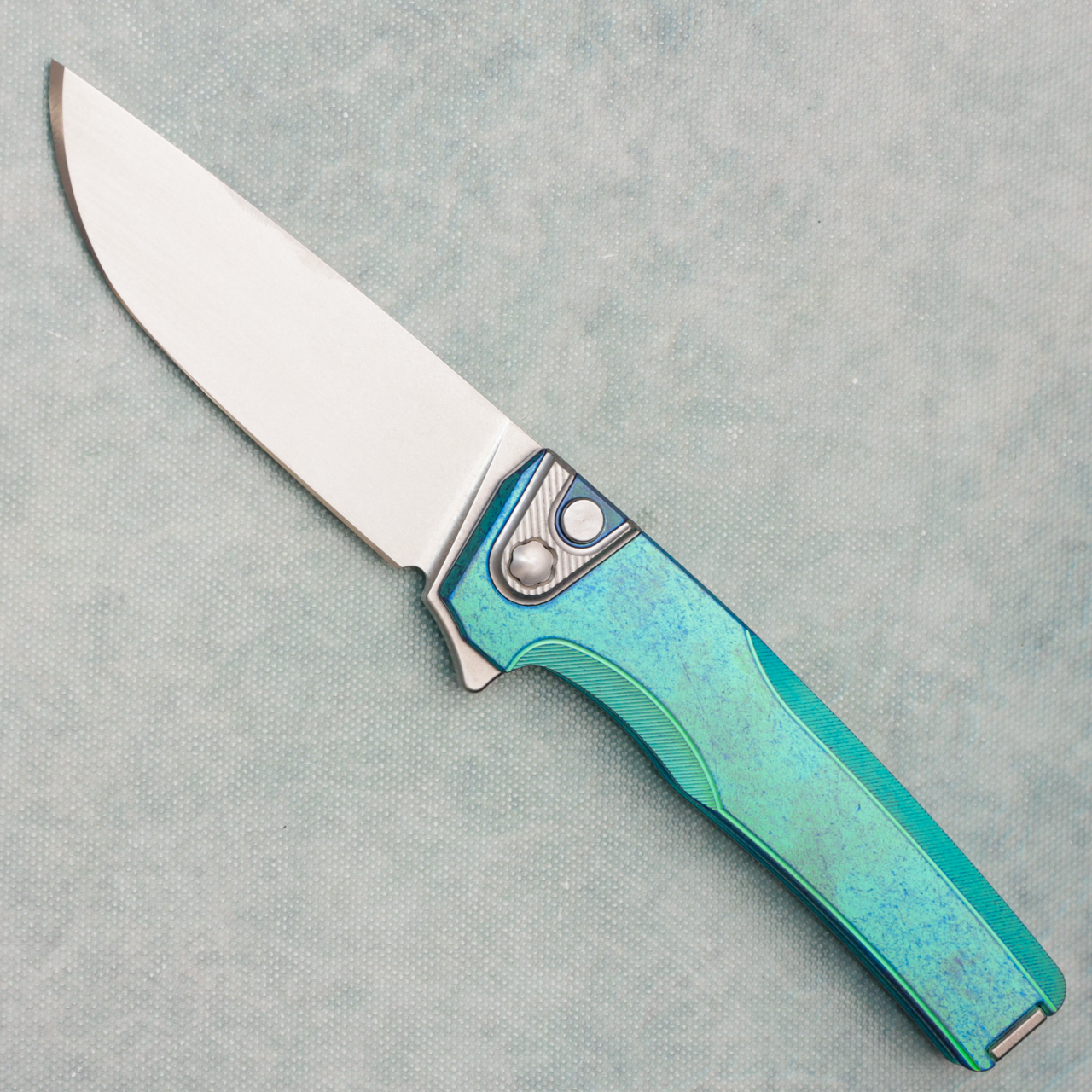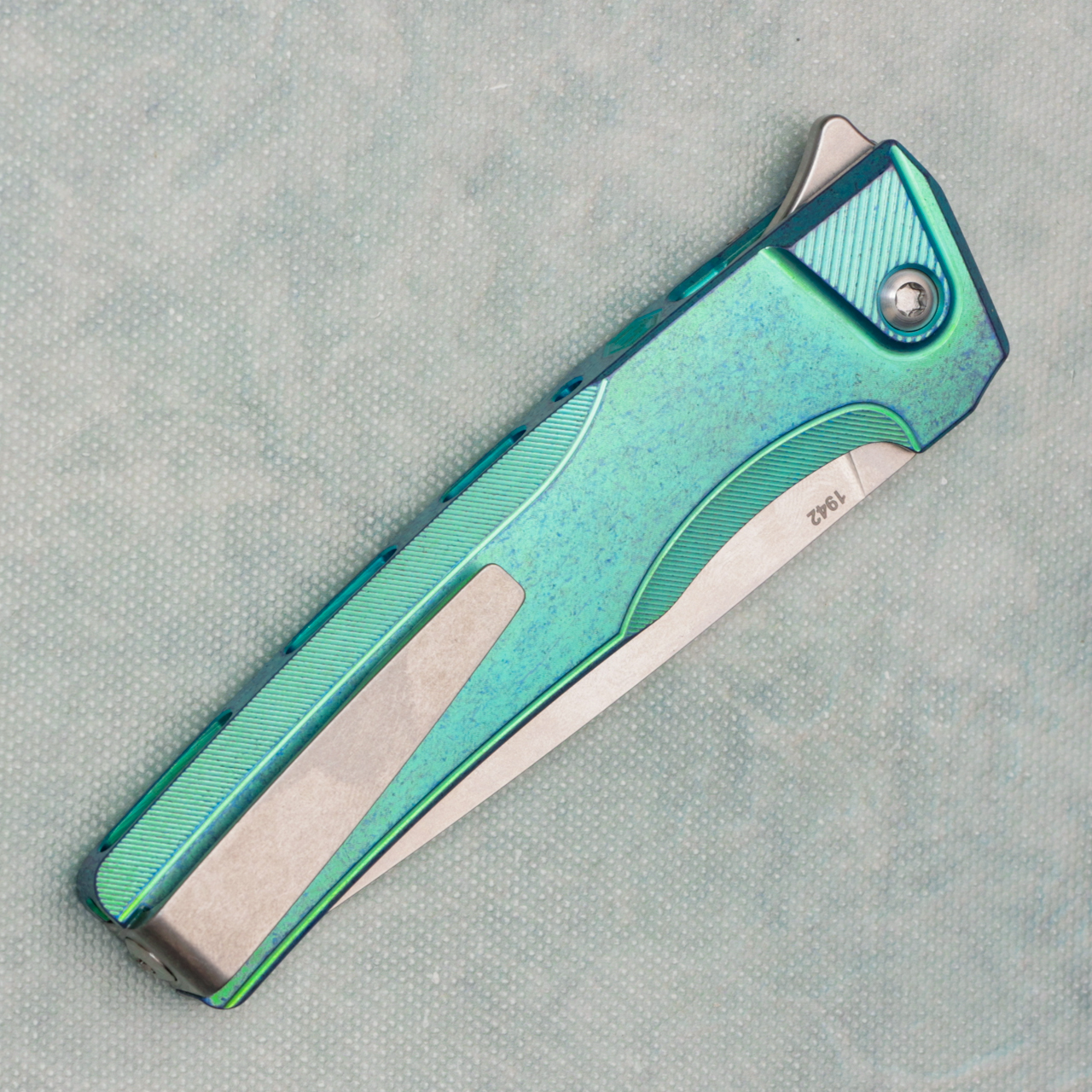 This model features a green with navy blue heavy distressed anodized titanium integral smooth handle, and titanium bolster. Stonewash finished CPM-S90V stainless steel drop point blade. Brand new in hardcase with qc card, bolster coin, and bit.