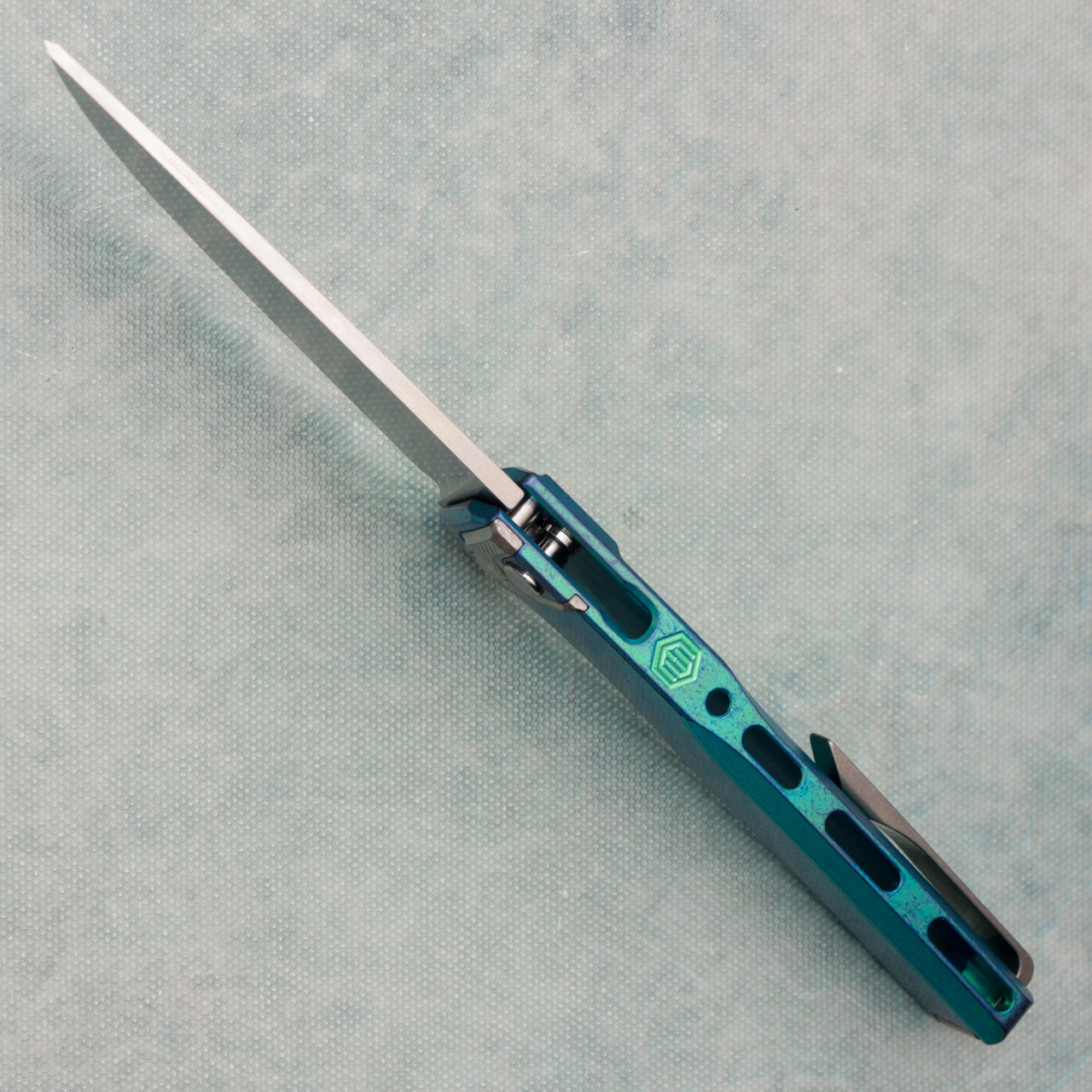 MachineWise Sonora Button Lock Flipper Green w/ Navy Distressed Anodized Smooth Titanium Integral Handle Titanium Bolster Stonewash S90V Blade