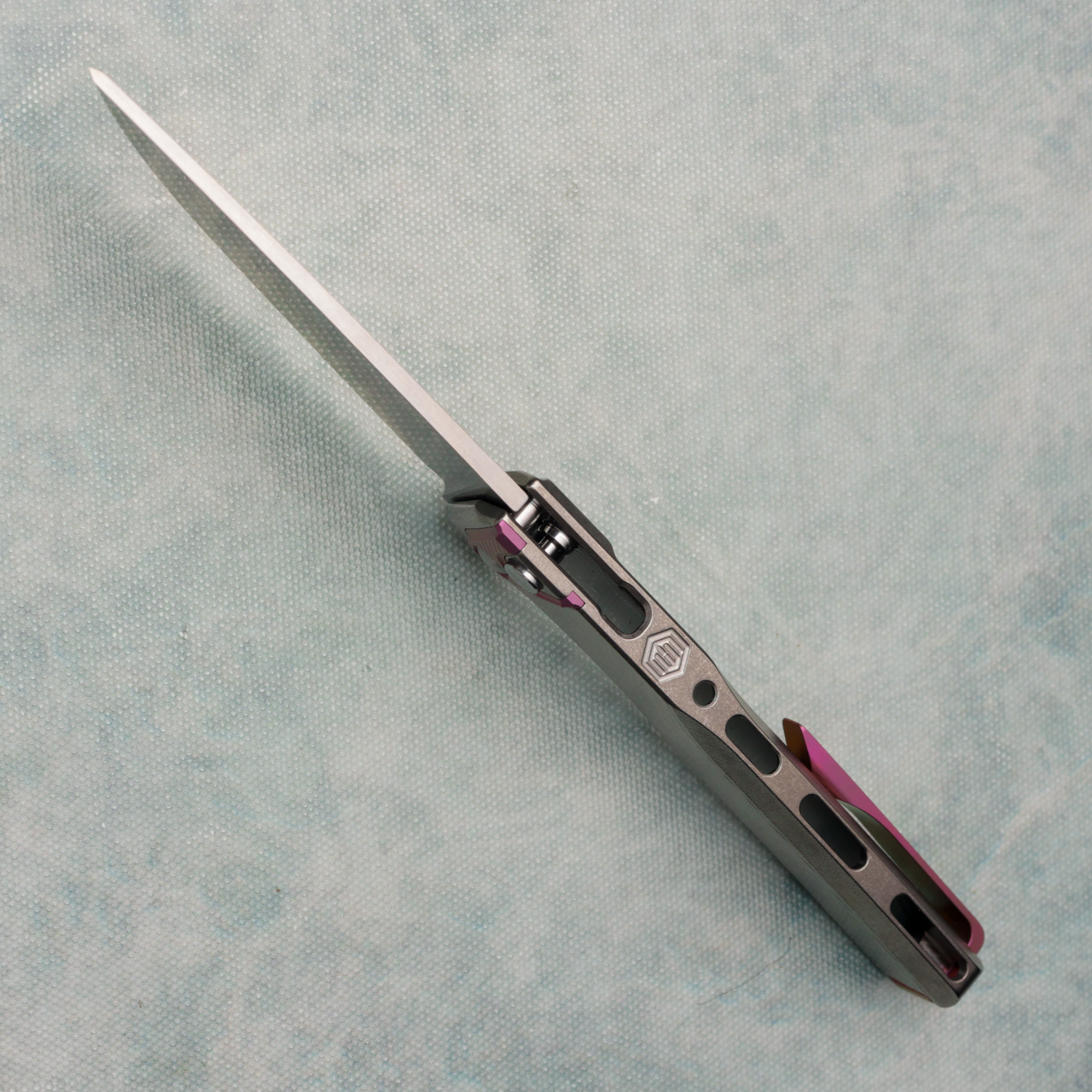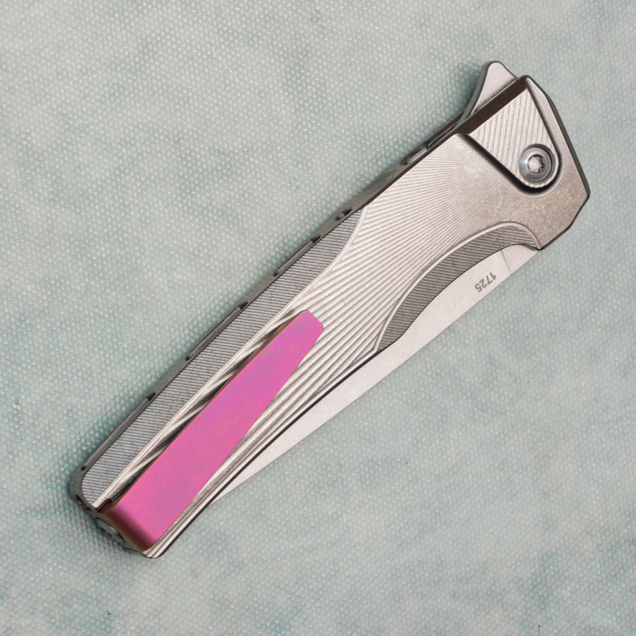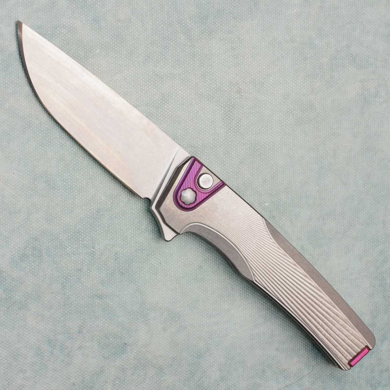 This model features a titanium integral handle with sunray texture, and pink anodized titanium bolster. Stonewash finished CPM-S90V stainless steel drop point blade. Brand new in hardcase with qc card, bolster coin, and bit.