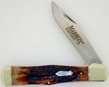 Quality Marbles Knives Stag Bone Series. All have stainless blades, stag bone handles and fancy nickel silver bolsters and inlaid shields. They all come in nice black zipper storage pouches that say MARBLES QUALITY KNIVES in orange. This one is the Coke Bottle Hunter with a large clip blade and nice file worked nail pull. Collect them all they are Very Nice!