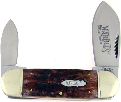 Real beautiful jigged brown stag bone handles. Stainless steel spear point blade etched MARBLE'S QUALITY KNIVES and a pen blade. Both blades have nice match striker nail pulls and good strong snap. Fancy fluted nickel silver bolsters. Brass liners and handle pins. Stainless steel inlaid Marbles bomb shield. Comes brand new in a Marble's zip-up pouch and a two piece box.