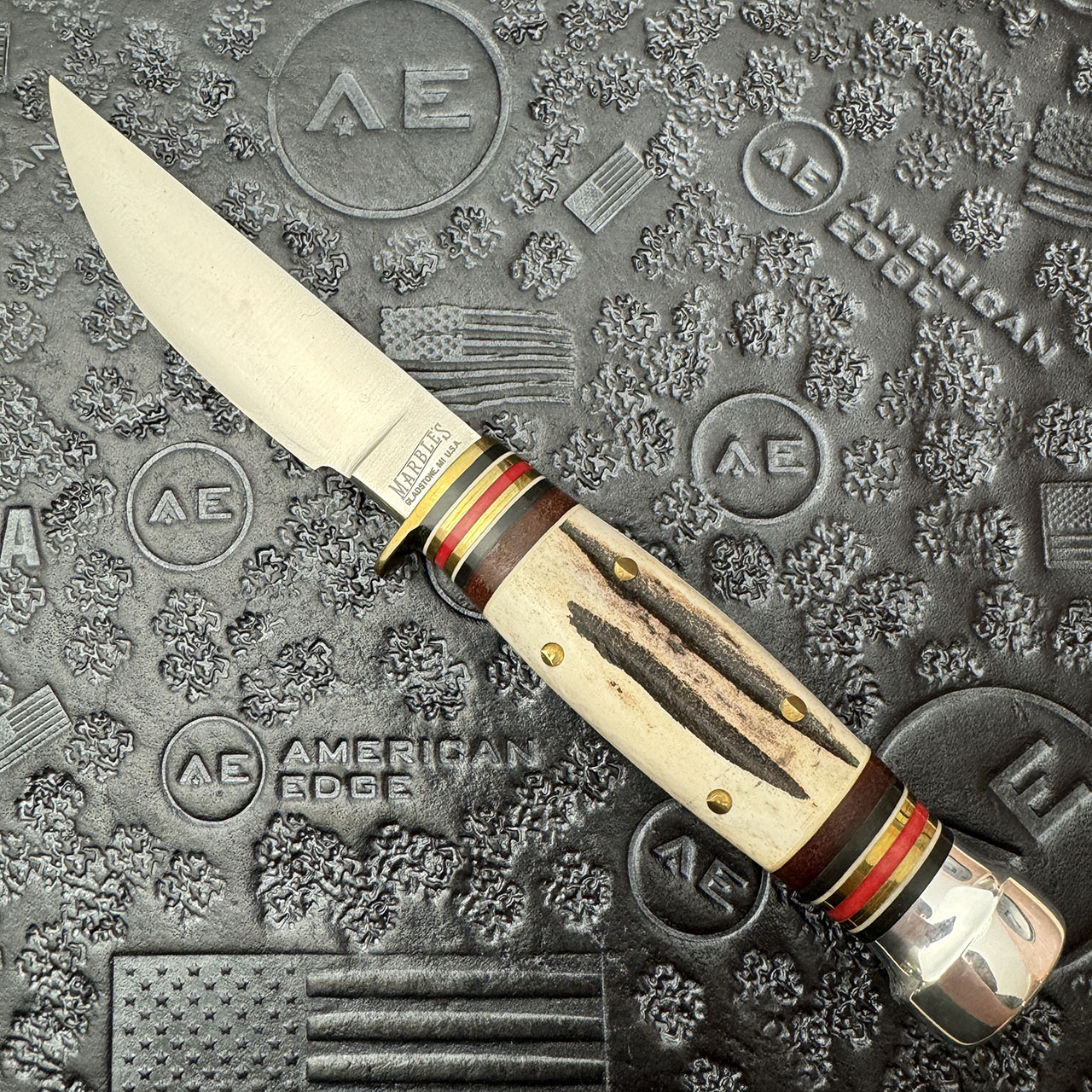 Marbles Mini Plainsman Fixed Blade Leather Stag Leather Handle Aluminum Pommel Satin Blade