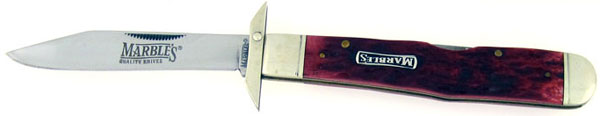 Nice jigged red bone handles. 440 Stainless steel clip point blade etched MARBLE'S QUALITY KNIVES. Match striker nail pull. Fancy fluted nickel silver bolsters and swinging guard. Brass liners and handle pins. Stainless steel inlaid Marbles shield. Comes brand new in a nice Marble's zip-up pouch.