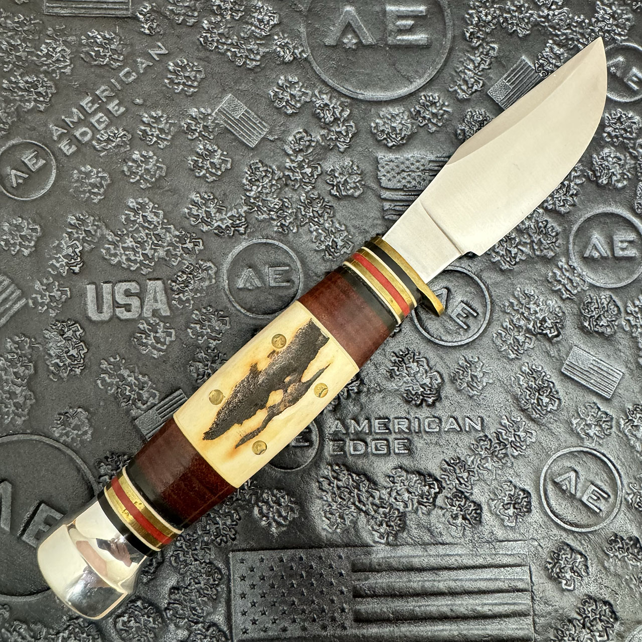 This beautiful Marbles Trailcraft has leather stag leather handles. Comes with leather sheath. New in box.