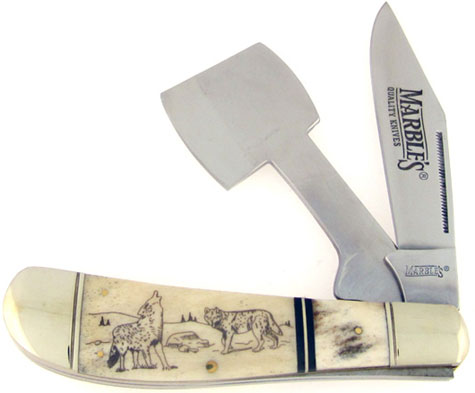 Real nice white bone handles with a cool scrimshawed Wolf wildlife scene and has black/nickel silver spacers with genuine stag section. High polished stainless steel clip point blade etched MARBLE'S QUALITY KNIVES with a nice long match striker nail pull and folding pocket axe with integral finger guard. Both the blade and the axe have good strong snap. Fancy fluted nickel silver bolsters. Brass liners and handle pins. Comes brand new in two piece box.