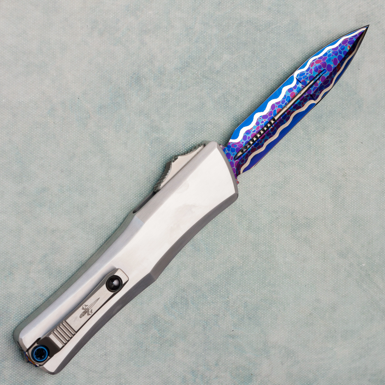 This custom model features a satin finished stainless steel handle with blue hardware and a flamed titanium accent glass breaker. Blued Bertie Rietveld Dragonskin Ball Bearing San Mai Damascus double edge dagger blade. New in box with the certificate of authenticity plate and accessories.