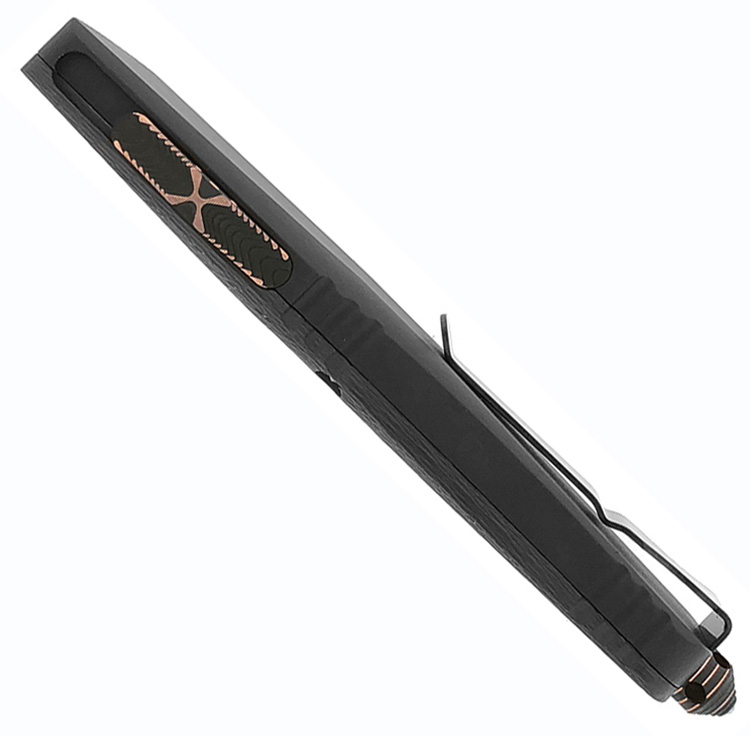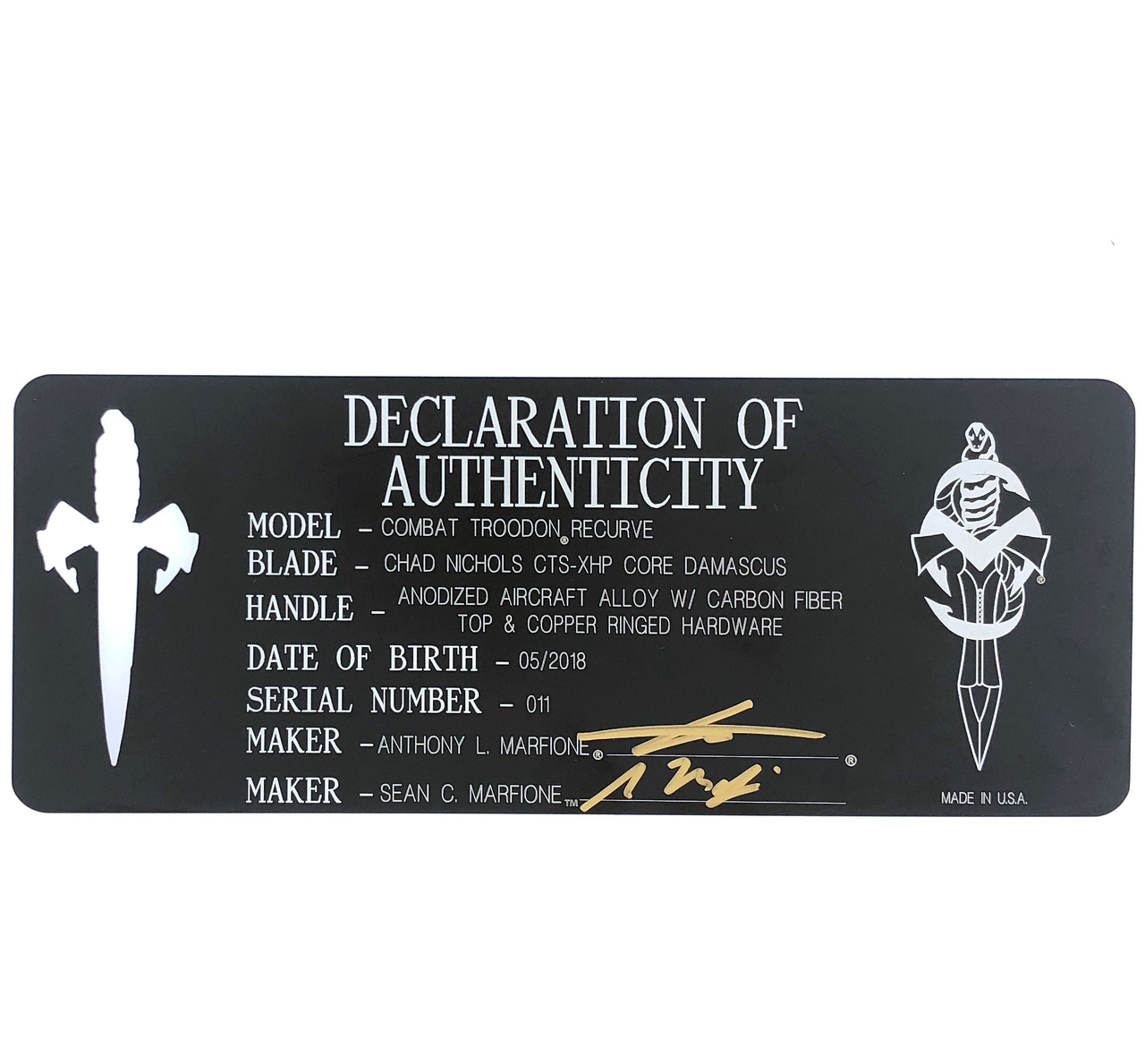 This custom model features a black anodized 6061-T6 aluminum handle with a copper fiber top scale. Gorgeous Chad Nichols CTS-XHP core Damascus recurve blade. Ringed copper hardware and glass breaker with lanyard hole. Black pocket clip has the Marfione Dagger logo, model information, serial number, and date of birth. Brand new in box with certificate plate and all original accessories.
