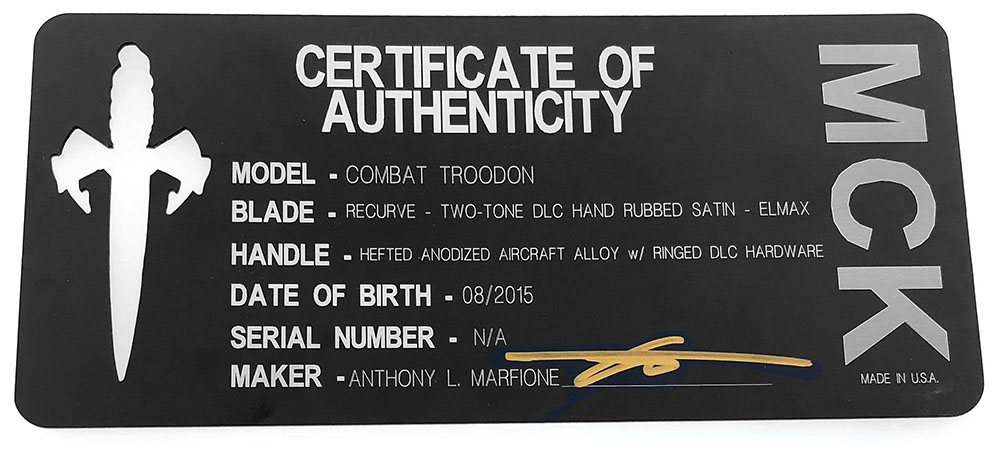Marfione Custom Combat Troodon Recurve Two Tone DLC Hand Rubbed Satin Blade Hefted Aluminum Handle Ringed DLC Hardware