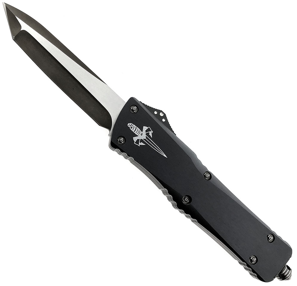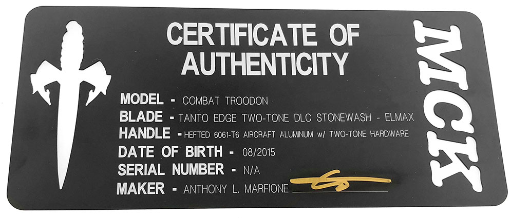 This custom model features black anodized 6061-T6 hand hefted aluminum handle scales featuring a nice big Marfione Dagger logo on the front. Hand ground two tone DLC stonewash finished ELMAX stainless steel compound tanto blade. Two tone ringed hardware and glass breaker with lanyard hole. Black pocket clip has the Marfione Dagger logo, model information, and date of birth. Like new in box with certificate of authenticity plate and original accessories (the box has a little bit of light shelf wear and the polishing cloth is missing, otherwise the knife is as new).