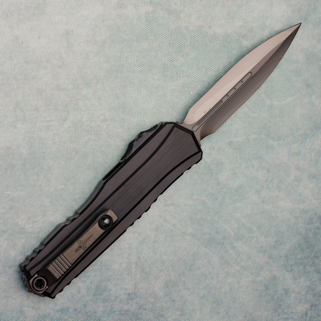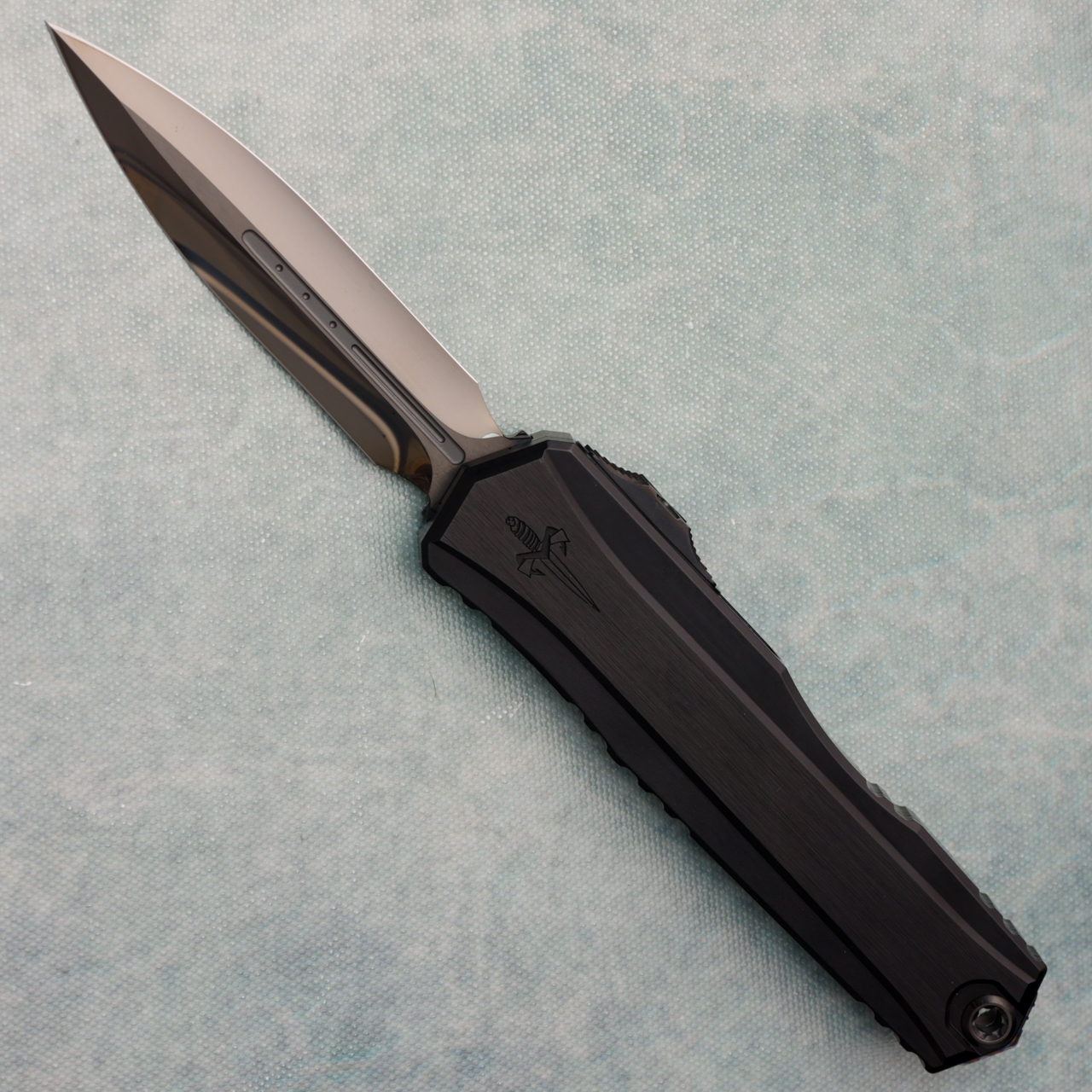 This Marfione Custom model features a black hefted aluminum handle. DLC diamondwash double edge dagger blade. Flamed titanium glass breaker. Brand new in box.