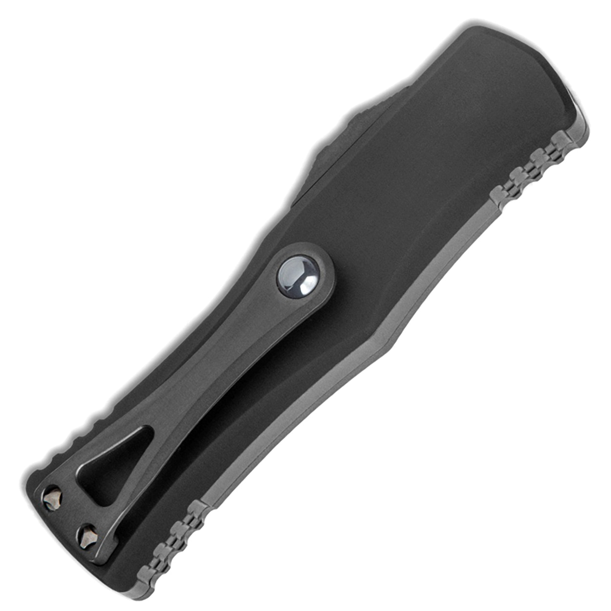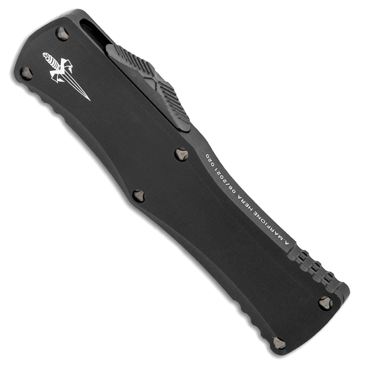 The Hera from Microtech knives is a stunning double action OTF knife. It features a symmetrical handle shape with excellent ergonomics. The frag pattern machined textured areas near the end of both sides of the frame enhance grip and add something great to the overall style. This knife is stylish and the perfect size for everyday carry. Smooth and strong action. A large milled rollerball clip and double blade fullers round out this package and make it stand out in a crowded field of OTF offerings!