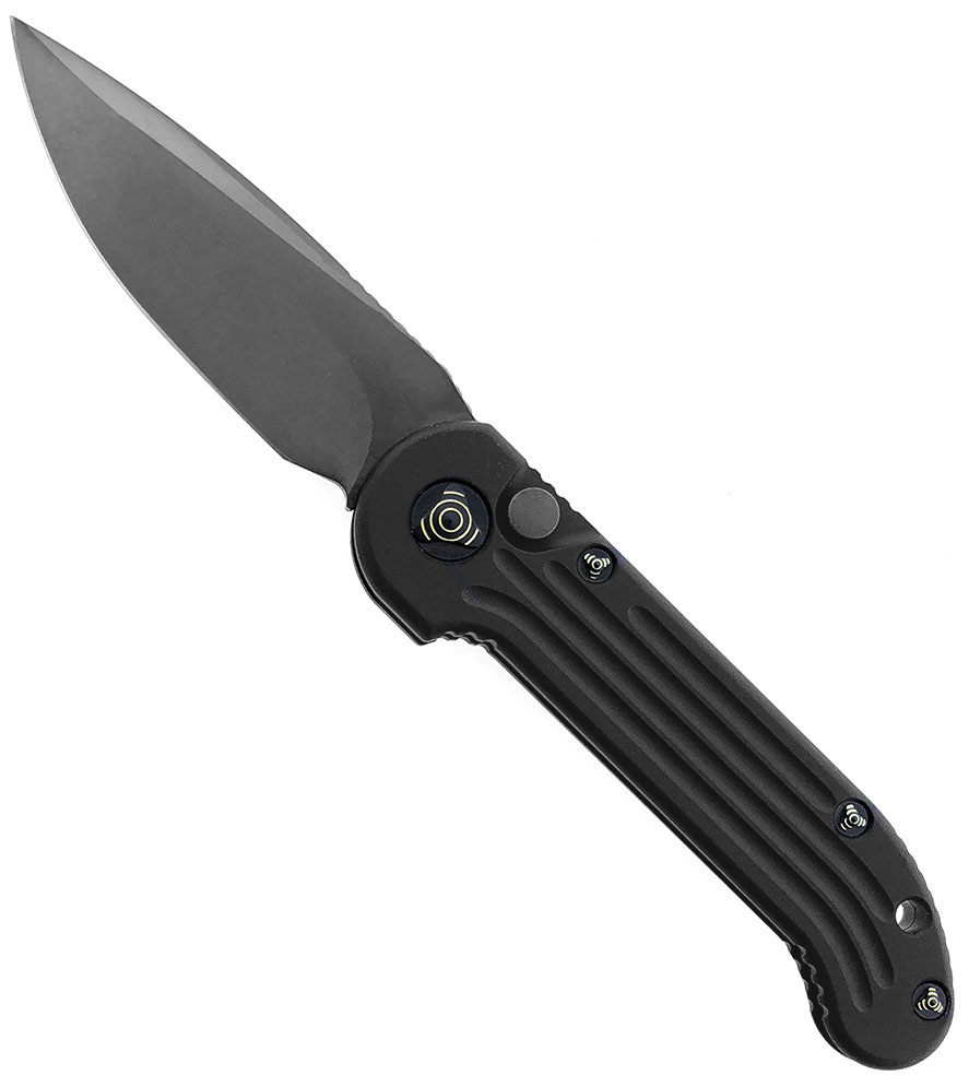 This custom model has a grooved anodized aircraft aluminum alloy handle. Two tone DLC stonewash finished ELMAX stainless steel drop point blade. Lanyard hole. Gold ringed titanium hardware. Black finished pocket clip that is marked with the Marfione Dagger logo, model information, production date, serial number, and A. Marfione. Serial number #018. An excellent choice for a high end EDC! Brand new in box with certificate of authenticity plate and all original accessories.