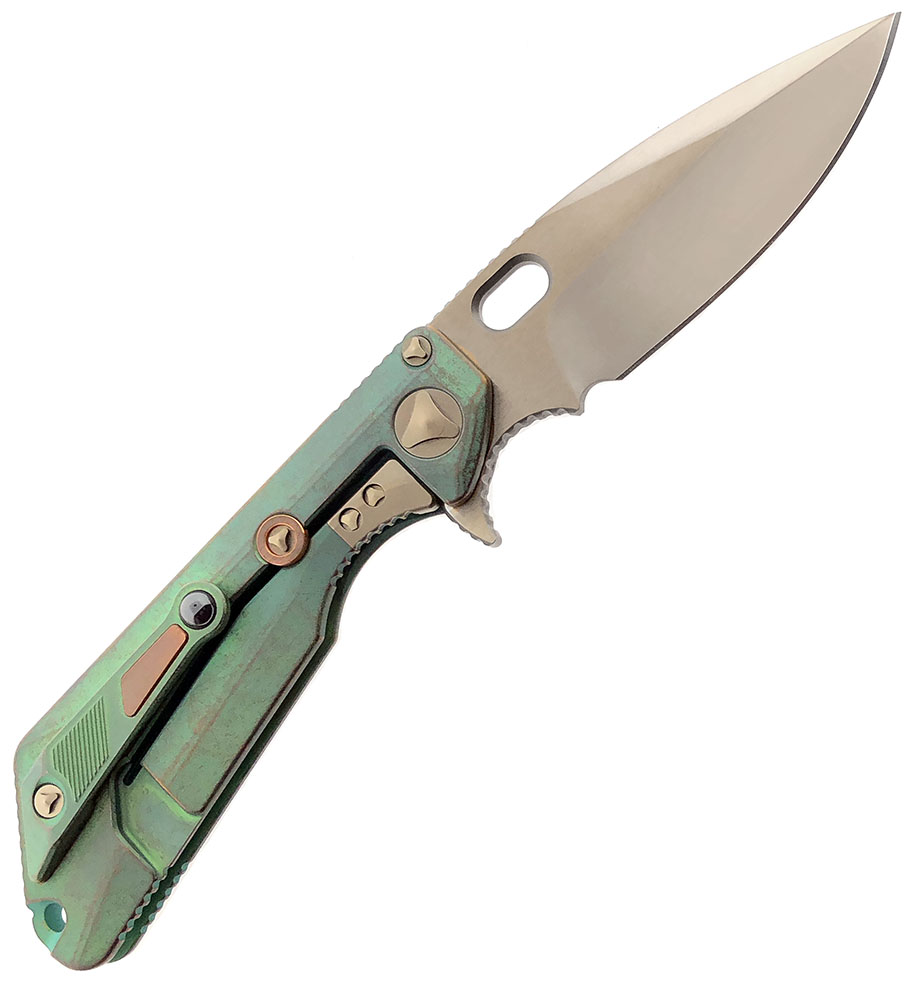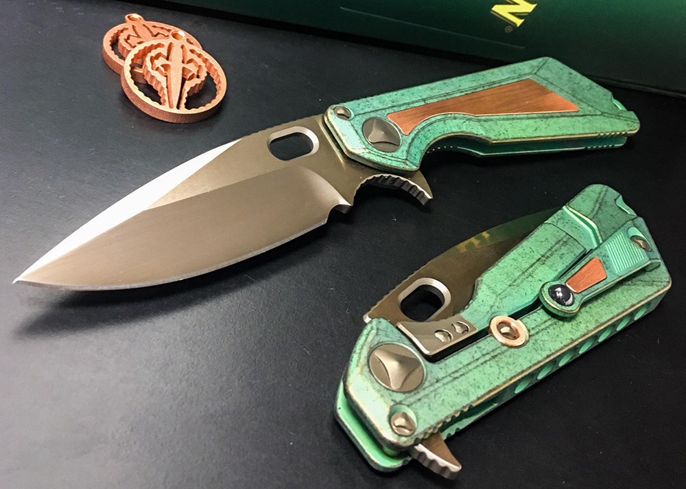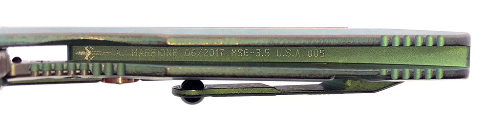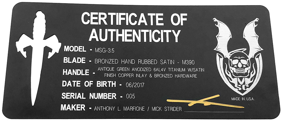 This custom model features a gorgeous antique green anodized integral 6AL4V titanium handle with a satin finished copper inlay. Integral frame lock with bronzed replaceable lock bar insert. Copper lock bar stabilizer. Bronzed hand rubbed satin finished hand ground M390 stainless steel spear point blade. Bronzed hardware. Matching antique green finished titanium pocket clip with satin finished copper inlay and ceramic ball bearing. The inside of the handle is marked with the Marfione dagger logo, model information, production date, serial number, and A. Marfione. Serial number #005. Like new in box with certificate of authenticity plate and all original accessories.
