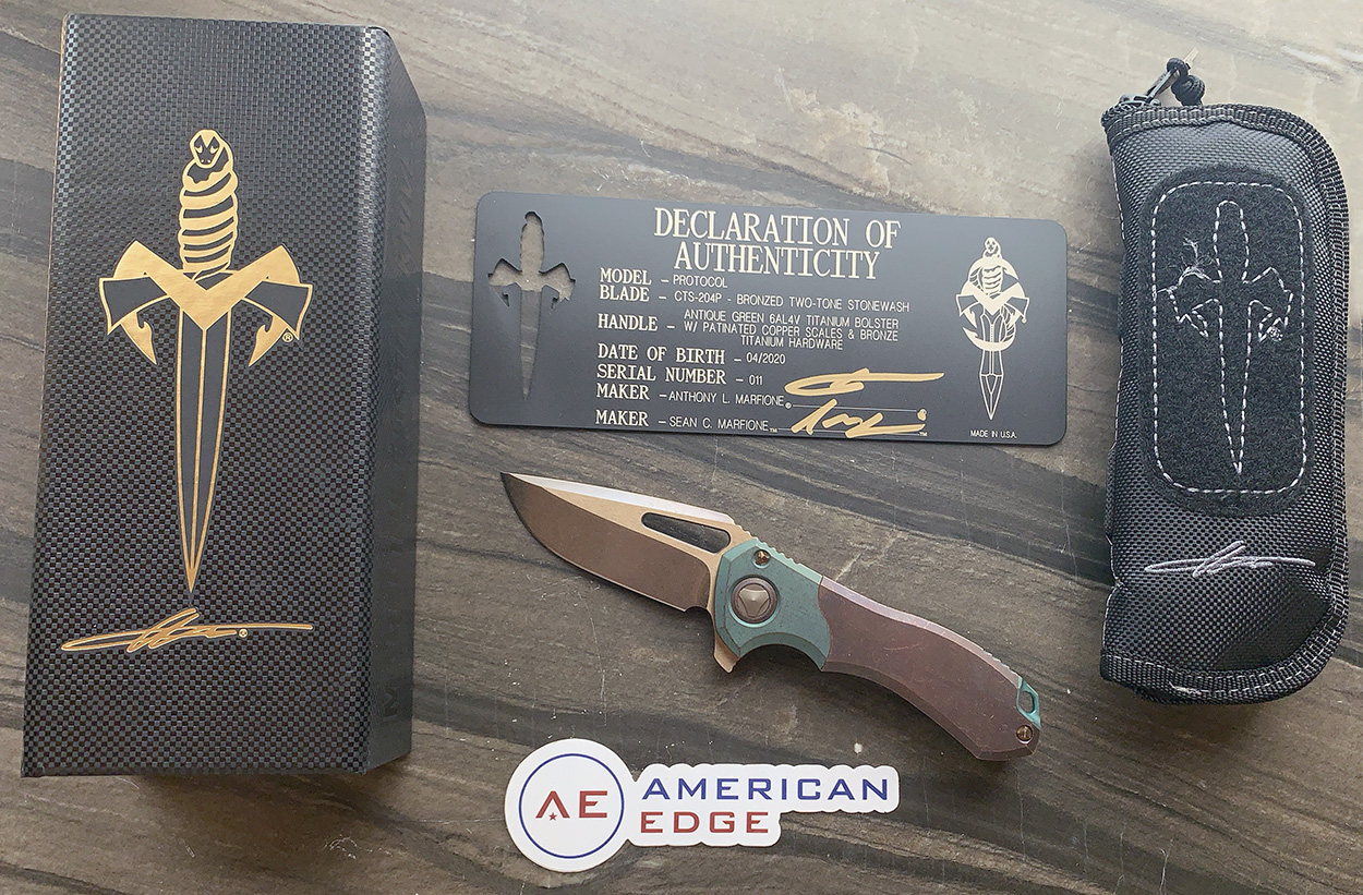 From the mind of Sean Marfione comes the Marfione custom Protocol frame lock flipper. It is medium sized knife that is robust but elegant with comfortable ergonomics. Super smooth flipper action. The titanium frame is antique green anodize finished with patinated copper handle scales. Bronze two tone stonewash finished CTS-204P stainless steel drop point blade. Matching antique green anodized milled titanium back strap with lanyard loop and titanium tip up deep carry pocket clip with inset ball and is etched with the Sean Marfione dagger logo. Bronze anodized titanium hardware. The serial number and production date are etched on the inside of the back strap. This one is looks awesome with its antiqued forced patina finish. What a gorgeous knife that is extremely well built with top notch hand fit, finishing, and materials! Brand new in box with all accessories and steel plate COA.