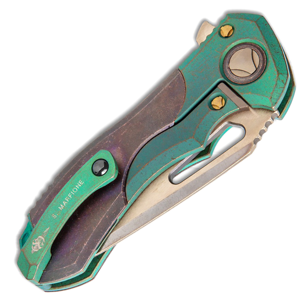 Marfione Custom Protocol Frame Lock Antique Green Titanium Handle w/ Patinated Copper Inlays Bronzed Two Tone Stonewash Blade Bronzed Ti Hardware