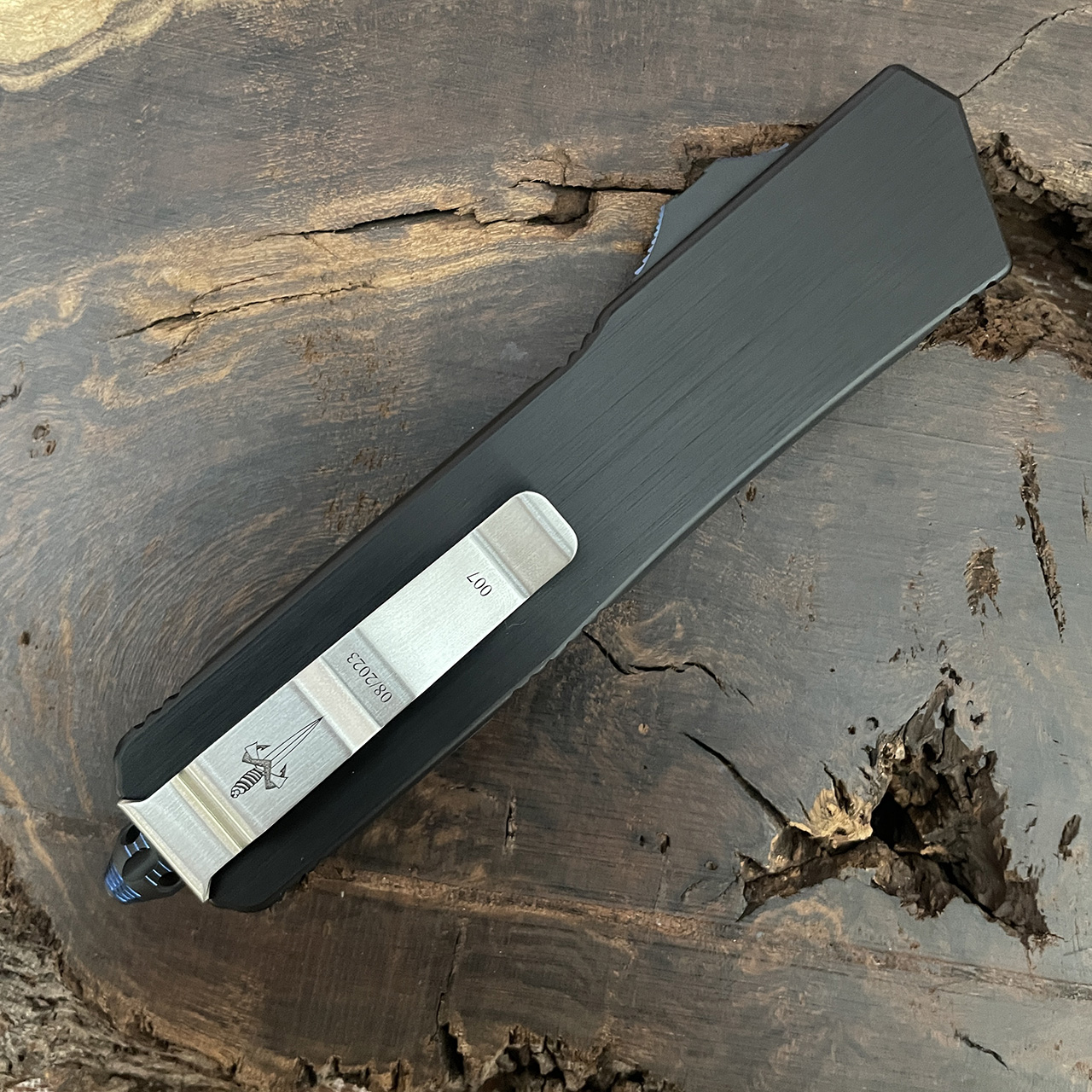 This Marfione Custom shop model features black anodized hefted aircraft aluminum alloy handle scales with the Marfione Dagger logo on the front and the Sean Marfione Dagger logo on the back. Hand rubbed satin finished M390 stainless steel DE-S blade. Blue ringed titanium hardware, glass breaker, and thumb slide. Reversible pocket clip. The clip features the Marfione Dagger logo, production date, and serial number. Brand new in box with all the accessories.
