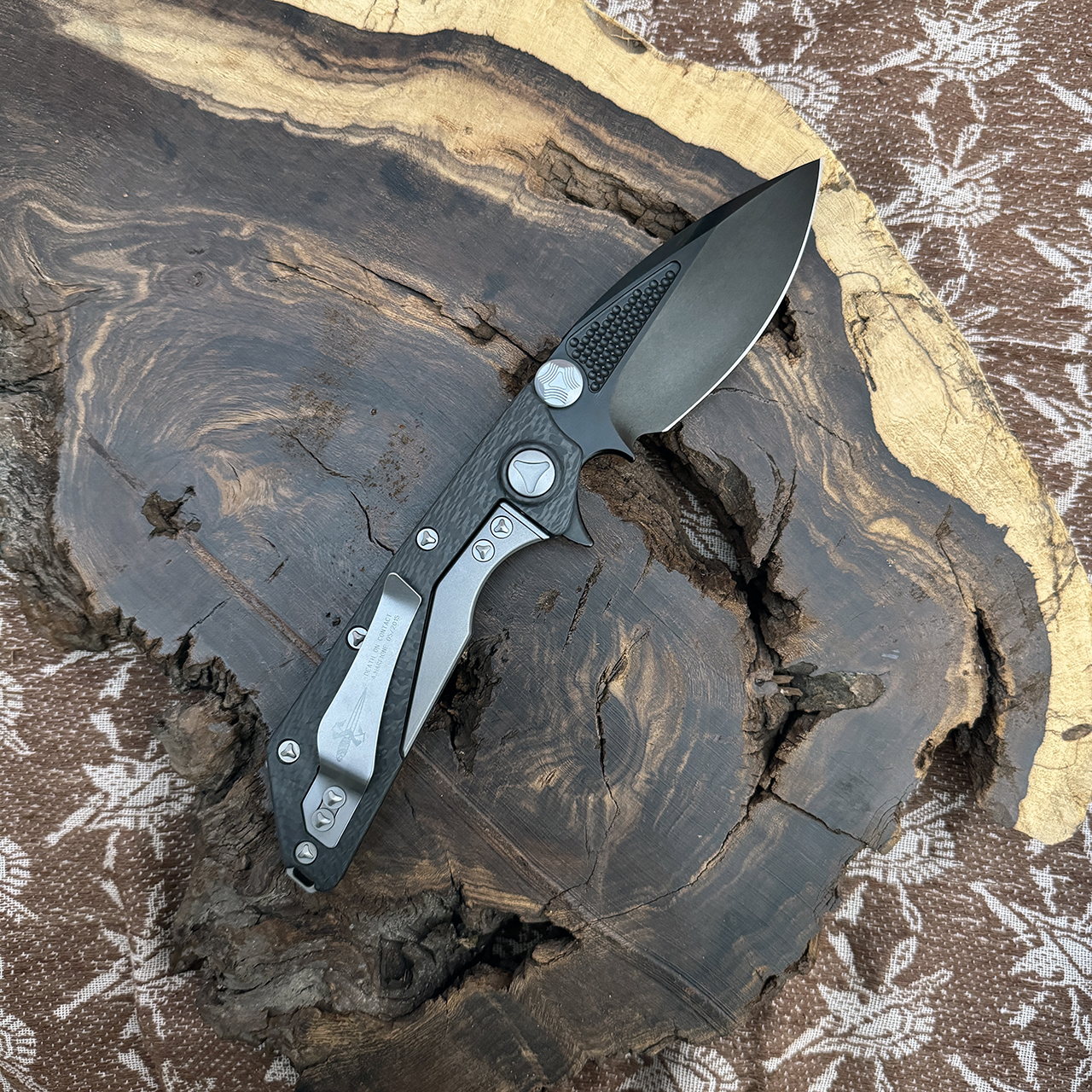 This model features a carbon fiber handle. DLC Tri-Tone Stonewash finished ELMAX blade with a standard edge. The hardware and pocket clip are bead blast finished. Brand new in box with COA.