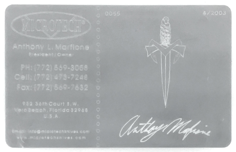 The Marfione Custom titanium business card is a must have for any Microtech or Marfione collector. It features Anthony Marfione's signature, the Marfione Dagger logo, the Microtech logo and all of Microtech's contact info from when they were in Vero Beach, FL. The serial number is 0055 and it was made in April of 2003. This may be the coolest business card in existence. Brand new in original sealed plastic sleeve.