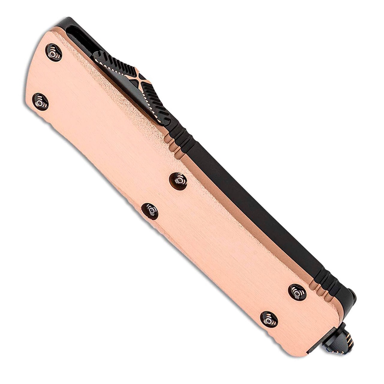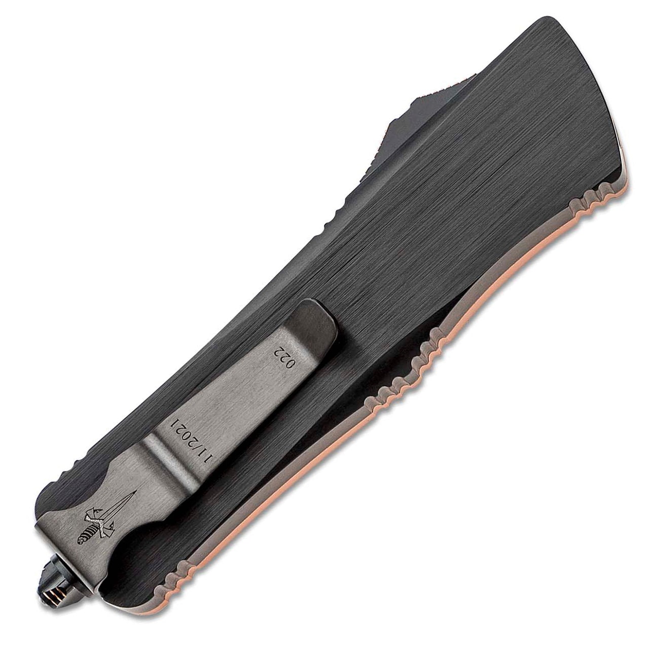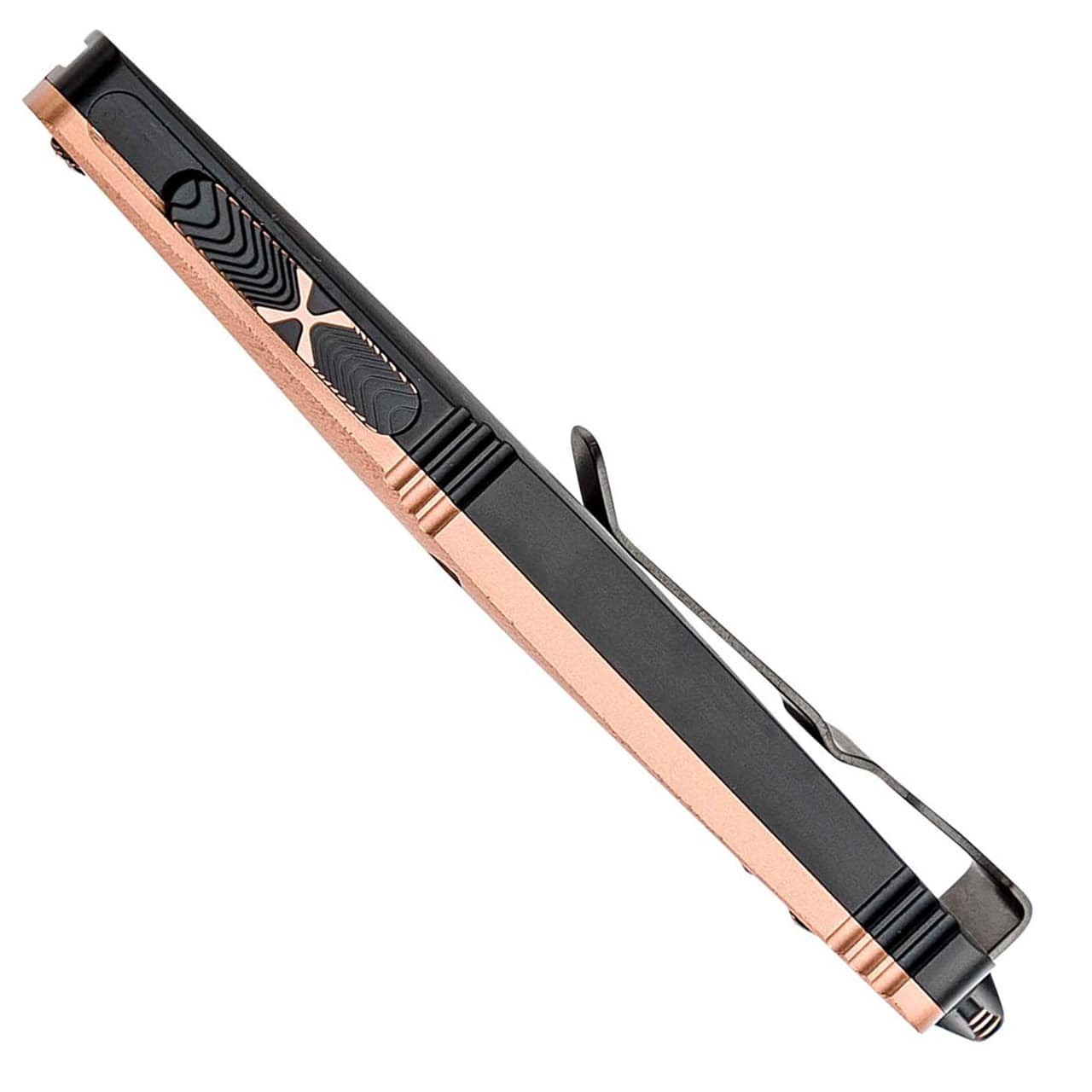 This Marfione Custom shop model features a satin finished copper top with stippled edges and a black anodized hefted aircraft aluminum alloy bottom handle. Hand ground Herringbone pattern damascus double edge dagger blade. Copper ringed hardware, glass breaker, and thumb slide. Black DLC finished reversible pocket clip. The clip is deep engraved with the Marfione Dagger logo, production date, model information, and serial number #029. Brand new in box.