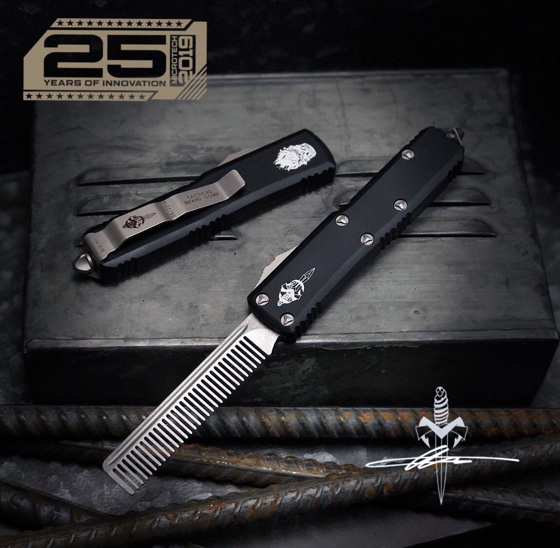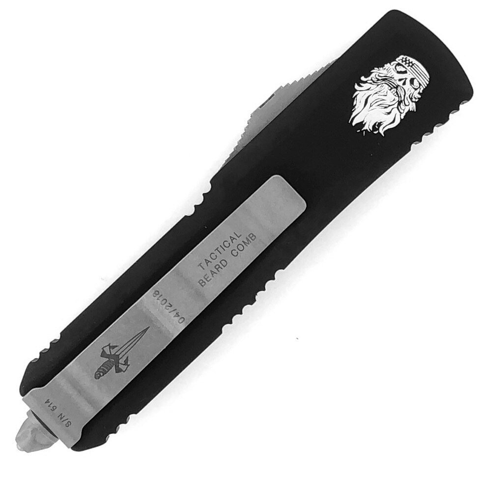 Stonewash finished 17-4 PH stainless steel fine tooth comb to tame even the most scraggly of beards. Built with the same quality as every other Microtech Marfione OTF knife. Black hard anodized 6061-T6 aluminum handle with Marfione Custom dagger logo on the front and The Real McCoy logo on the back. With its non-edged blade it is safe to carry with you anywhere you go and you will find that it is very hard to stop playing with. Bead blasted hardware, pocket clip and glass breaker. The pocket clip has the Dagger logo, production date, serial number and says "TACTICAL BEARD COMB". It comes with all of the Marfione Custom packaging and accessories including zip up pouch, polishing cloth, The Real McCoy logo coin, a bottle of The Real McCoy Beard Oil and Tony Marfione/Caylon McCoy signed steel certificate of authenticity. Brand new in box.