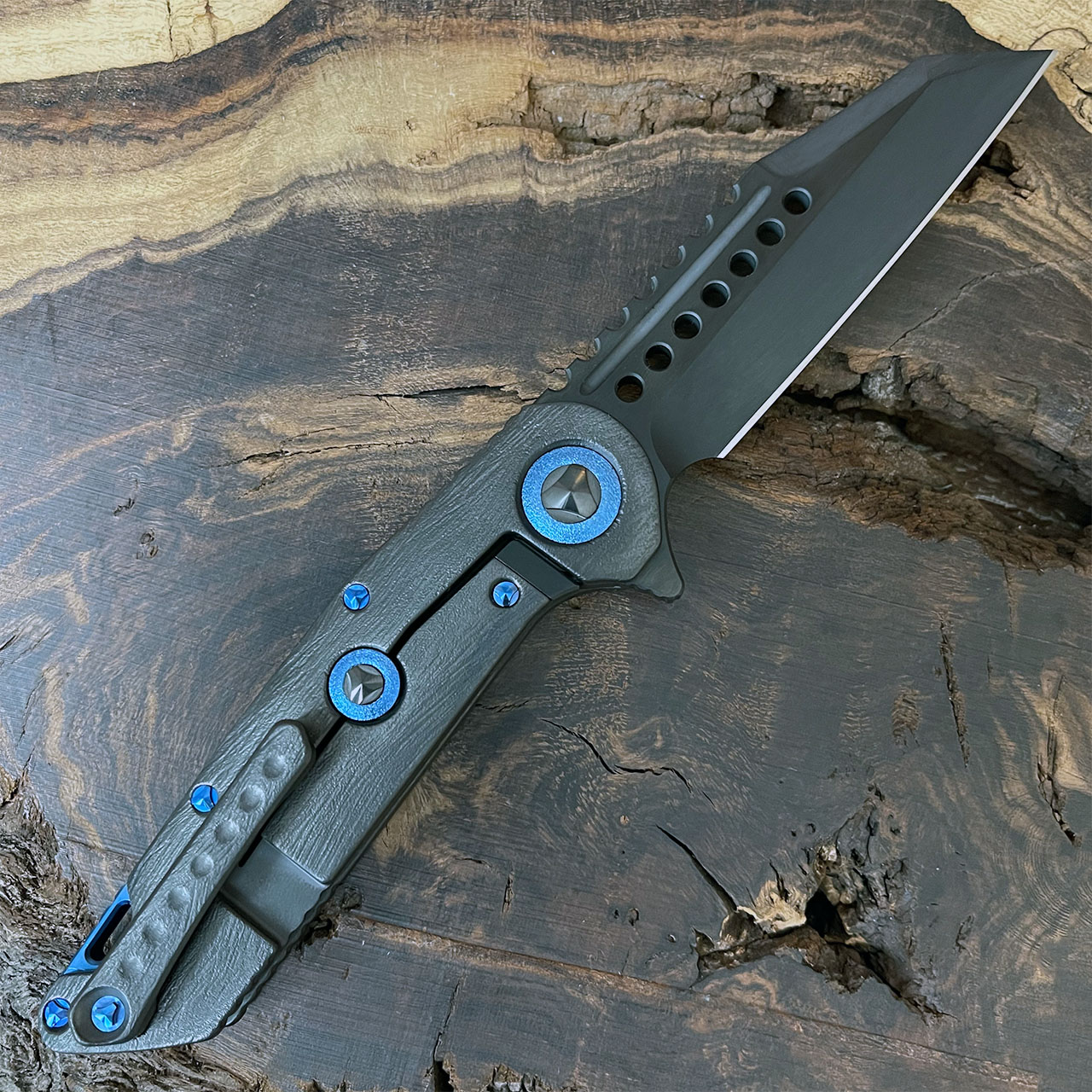 This Marfione Custom model features a bark textured DLC finished titanium handle. Two tone black DLC apocalyptic/satin finished blade. Blue titanium finished hardware ad pivot collars. Brand new in box with COA.