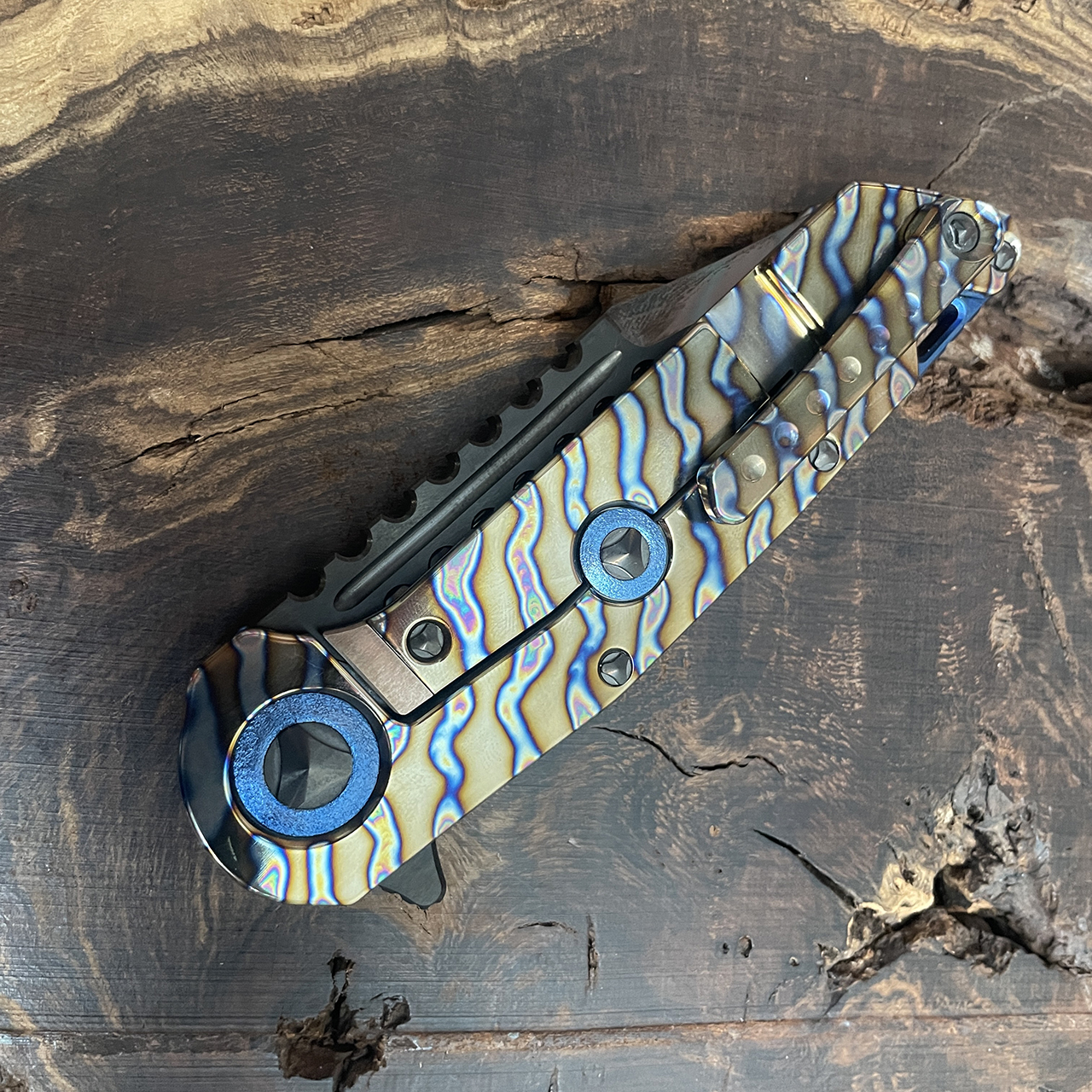 This Marfione Custom model features a flamed titanium with blue titaniu. DLC Diamondwash finished blade and DLC Two-Tone Hardware. Brand new in box with COA.