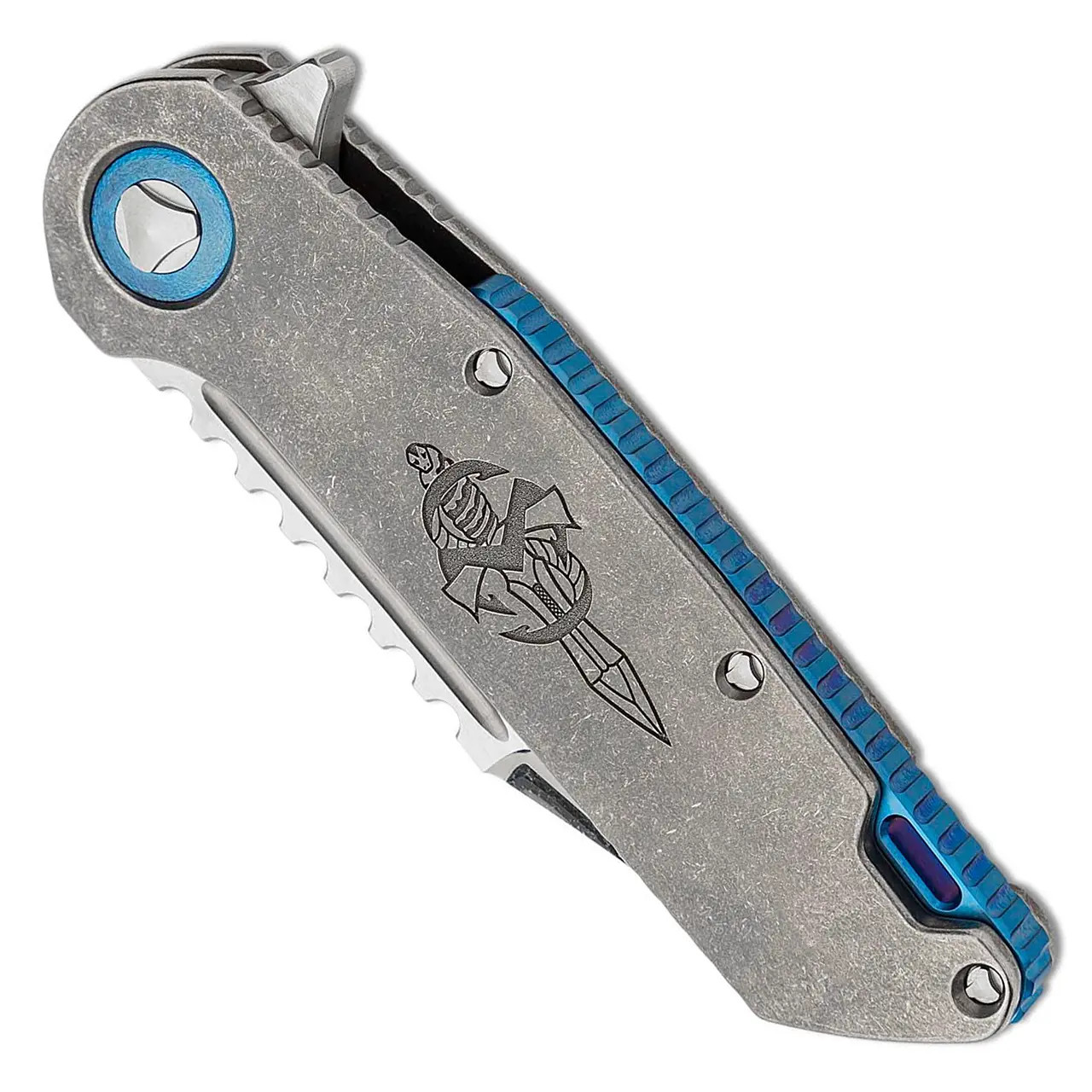 Marfione Custom Warhound Frame Lock Flipper Stonewash Titanium Handle w/ Deep Engraved Sean Marfione Dagger Logo Two Tone Stonewash Blade Blue Ti Accents (Pre-Owned)