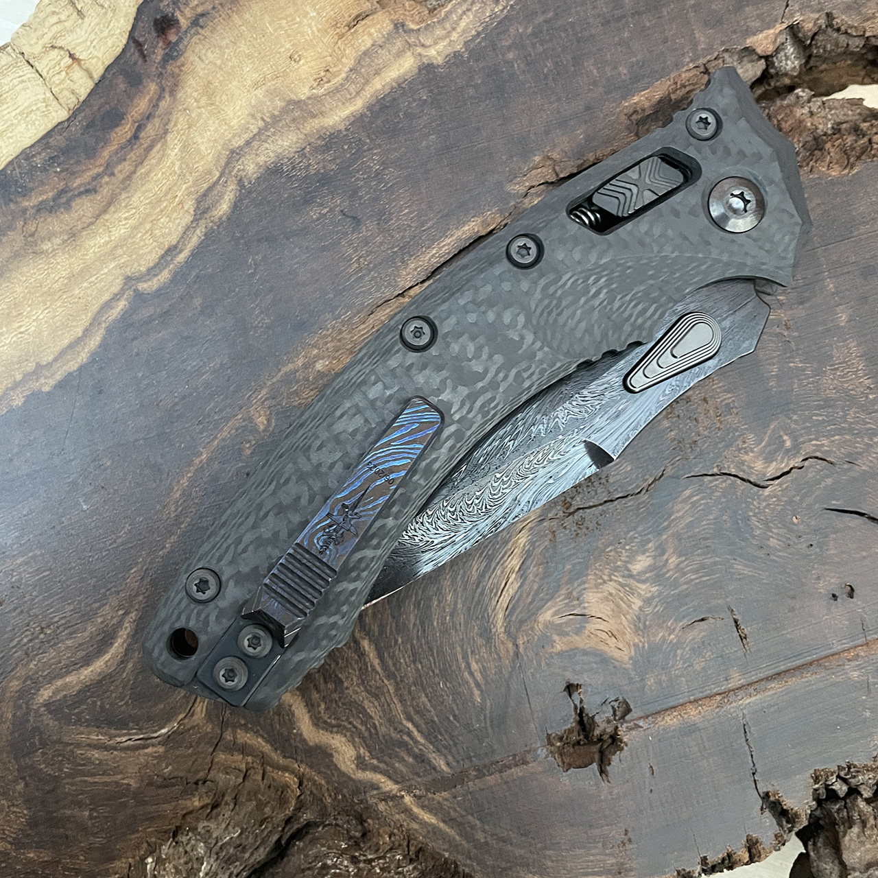 Marfione Customs Broken Anvil Amphibian RAM-LOK Carbon Fiber DNA Pattern Damascus w/ Damascus Pocket Clip DLC Two Tone Hardware