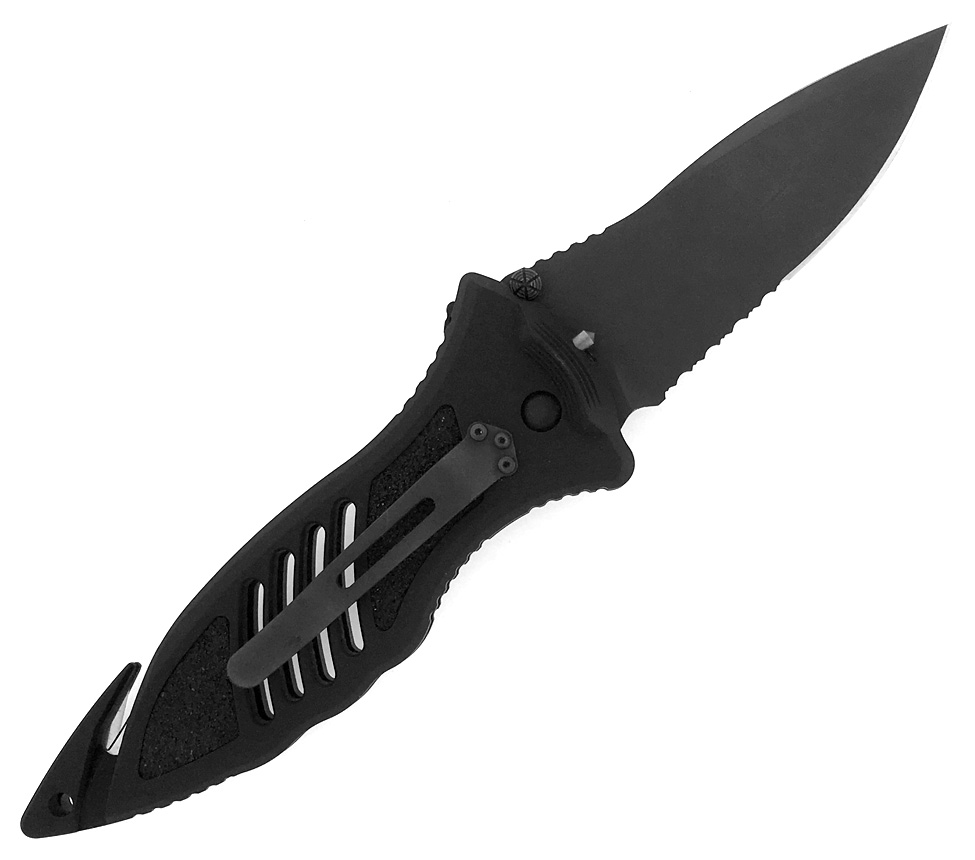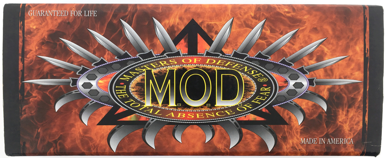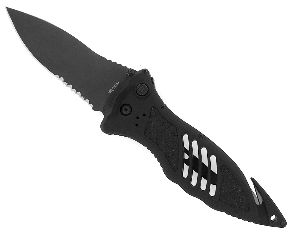 Fully 3-D machined T-6 aircraft aluminum handle scales with grip tape inserts and machined holes for better weight distribution. Black coated 154-CM high carbon stainless steel single edge spear point blade etched with the serial number #126 of 2000. Button lock manual action with a sliding lock on the thumb ramp. This big blade has smooth action and solid lock up. Jimping in all the right places for tactical grip and control. Lanyard hole and reversible black pocket clip. Quality double razor blade seat belt cutter. Tungsten tipped glass breaker is located on the top of the handle for convenience. High quality tactical operations knife by the Masters of Defense. This was a sterile limited edition run from years ago. Brand new in box with nylon sheath.