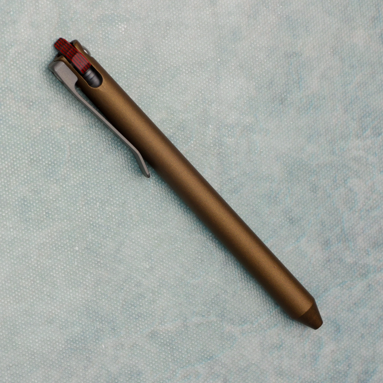 Aluminum body with burnt bronze cerakote, red and black g-10 flipper and titanium clip, unlike other pens on the market this pen comes with the ability to use your favorite refills. With this kit are 2 length adapters, 3 springs, and 3 popular refills.