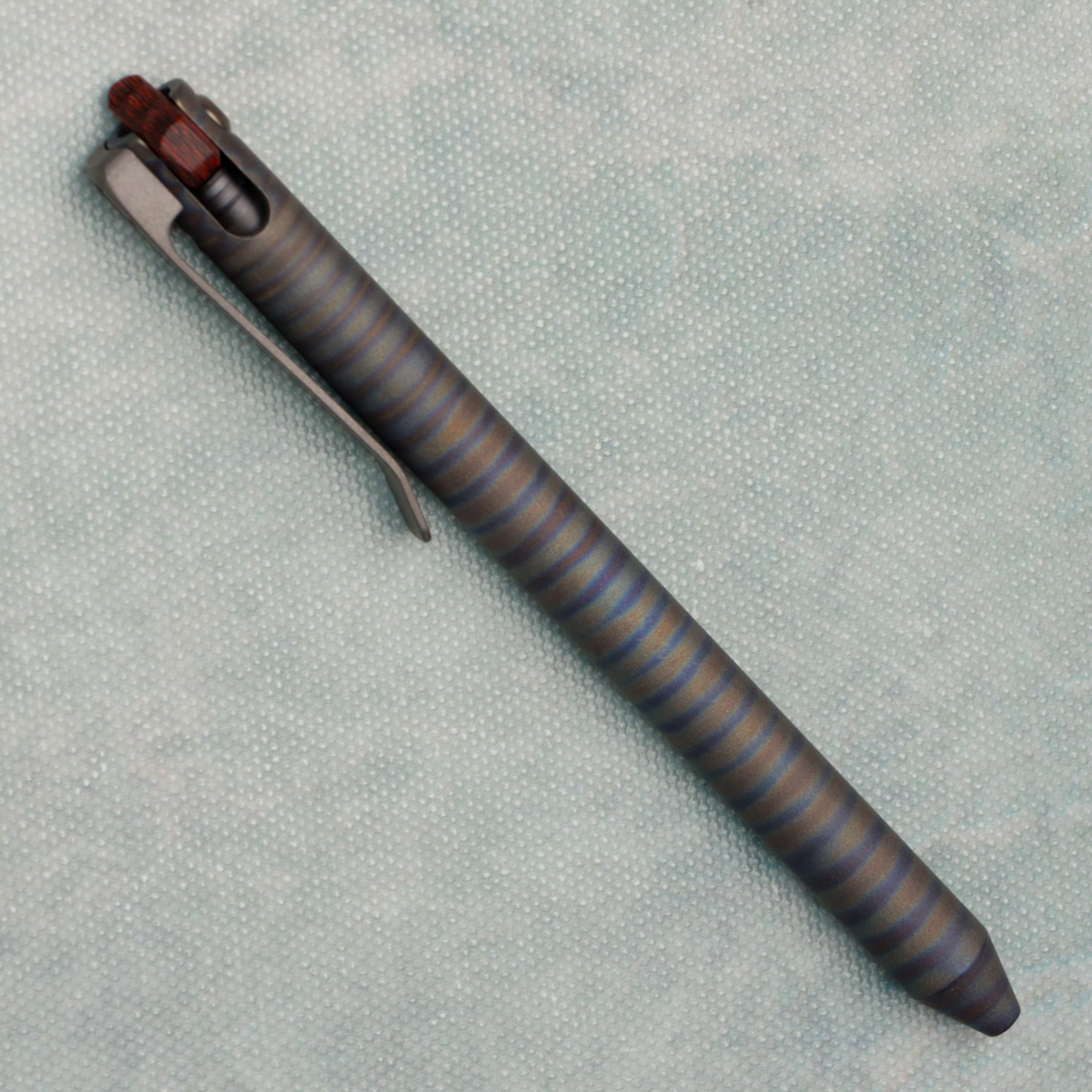 Flamed titanium body with lava flow fat carbon flipper and titanium clip, unlike other pens on the market this pen comes with the ability to use your favorite refills. With this kit are 2 length adapters, 3 springs, and 3 popular refills.