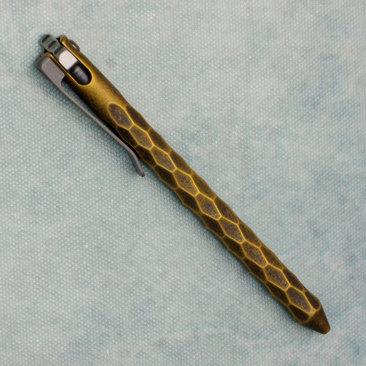 Sculpted antique brass body with titanium flipper and titanium clip, unlike other pens on the market this pen comes with the ability to use your favorite refills. With this kit are 2 length adapters, 3 springs, and 3 popular refills.