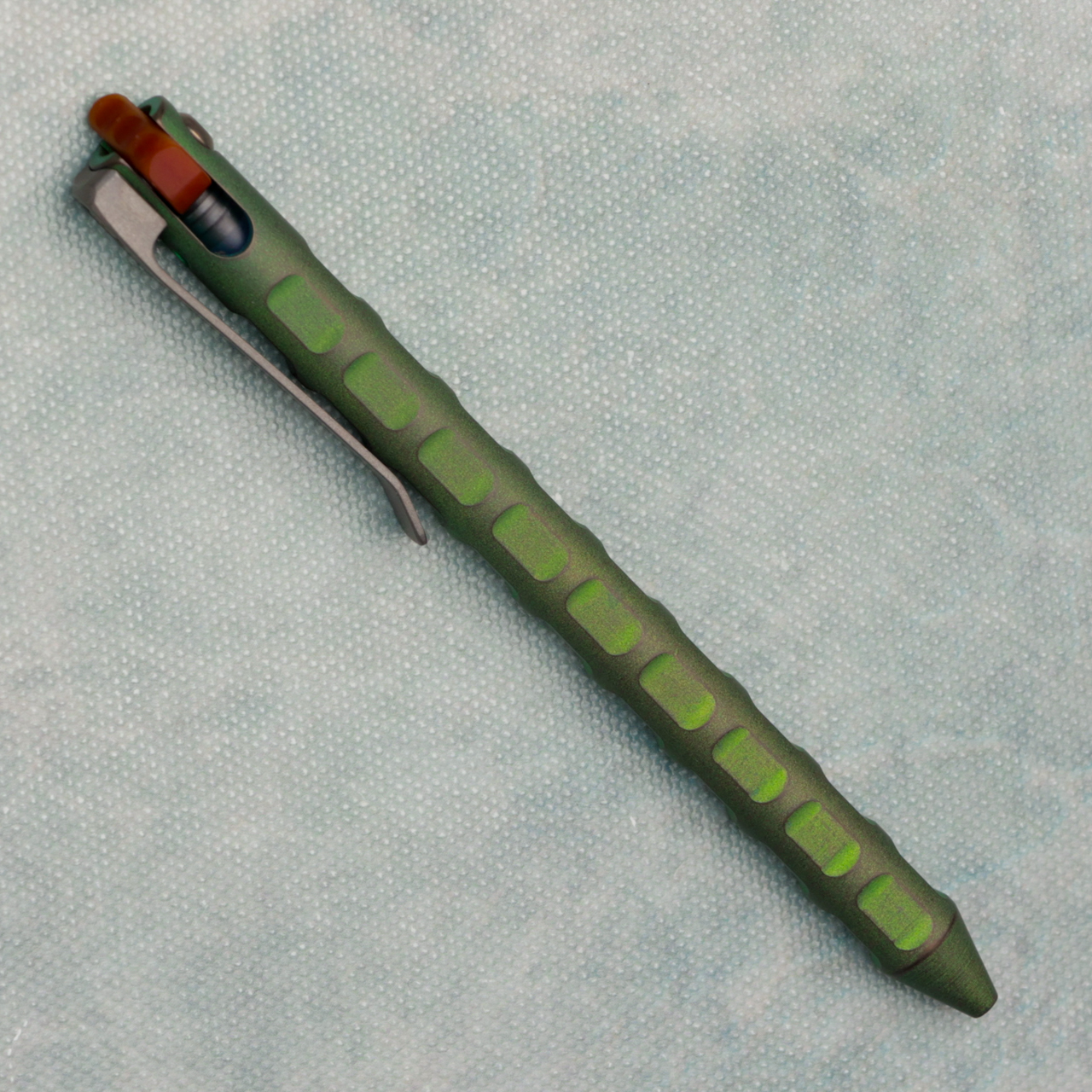 Sculpted green and bronze anodized titanium body with butterscotch flipper and titanium clip, unlike other pens on the market this pen comes with the ability to use your favorite refills. With this kit are 2 length adapters, 3 springs, and 3 popular refills.